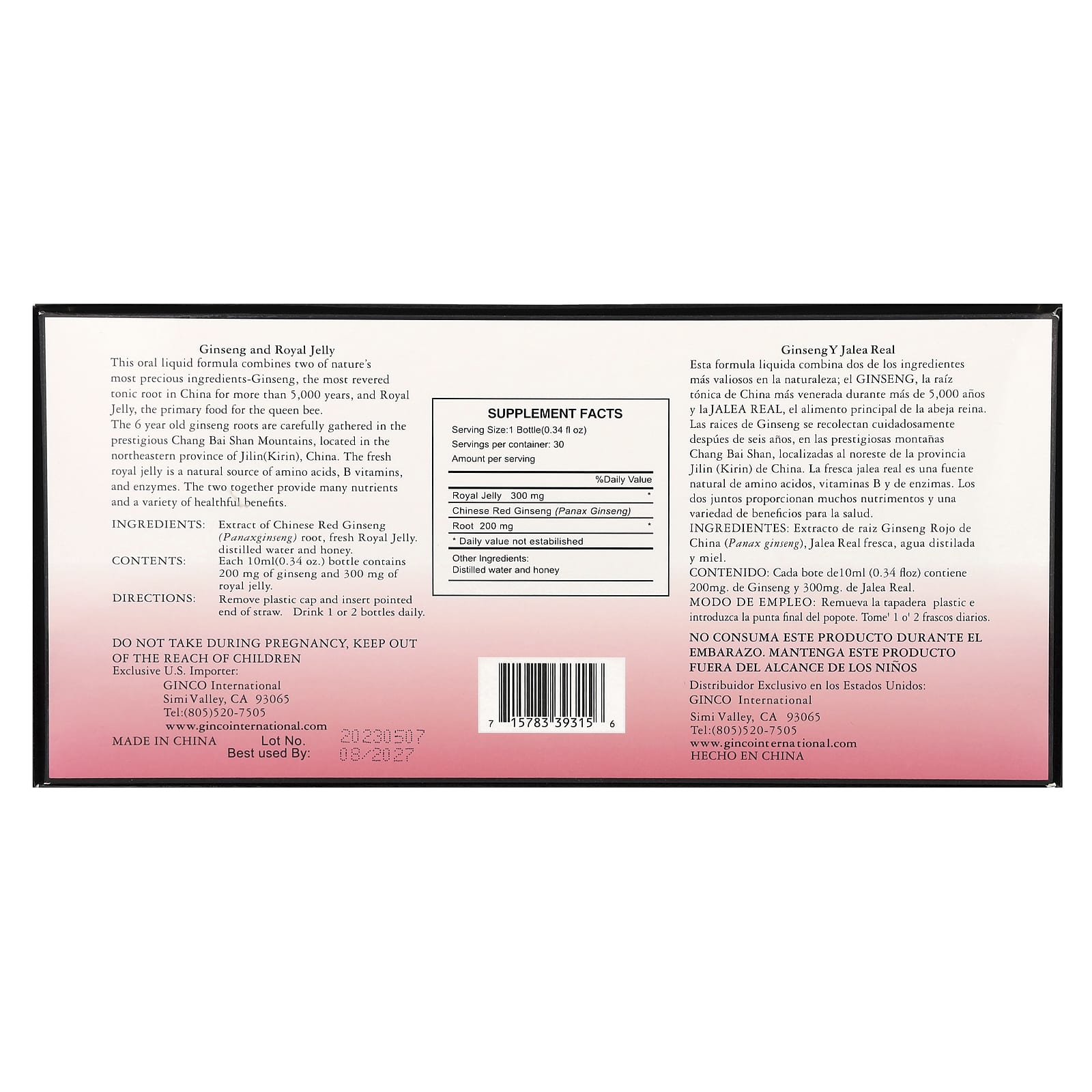 Ginseng e Geleia Real Esta fórmula líquida oral combina dois dos ingredientes mais preciosos da natureza: o Ginseng, a raiz tônica mais venerada na China há mais de 5.000 anos, e a Geleia Real, o principal alimento para a abelha rainha. As raízes de ginseng de 6 anos são cuidadosamente colhidas nas prestigiosas Montanhas Chang Bai San, localizadas na província nordeste de Jilin(Kirin), na China. A geleia real fresca é uma fonte natural de aminoácidos, vitaminas B e enzimas. Os dois juntos fornecem muitos nutrientes e uma variedade de benefícios saudáveis.