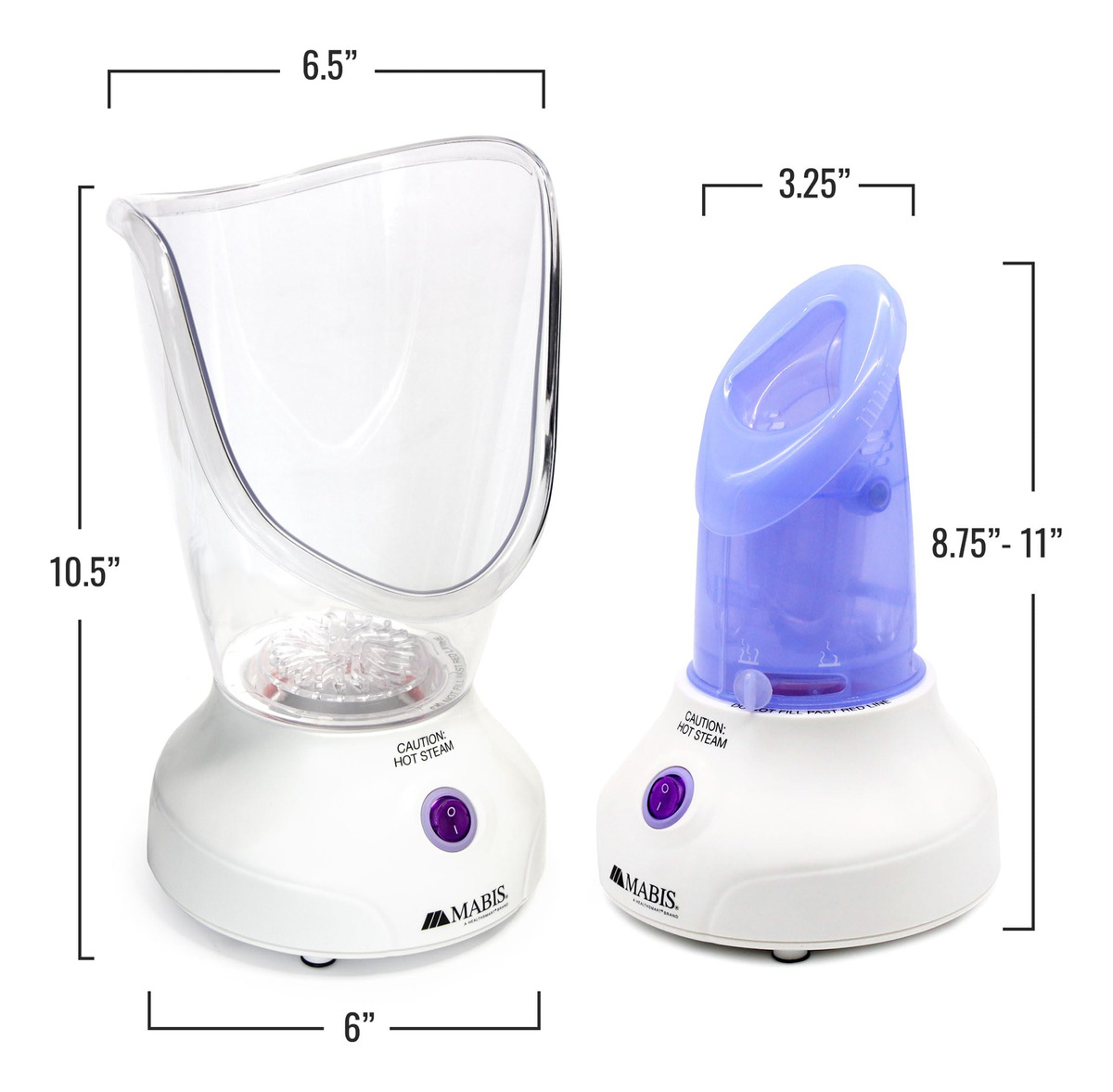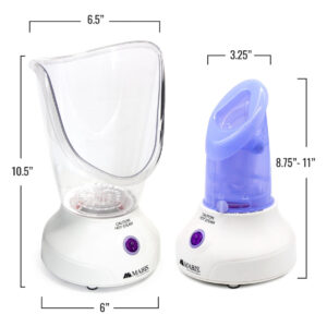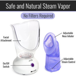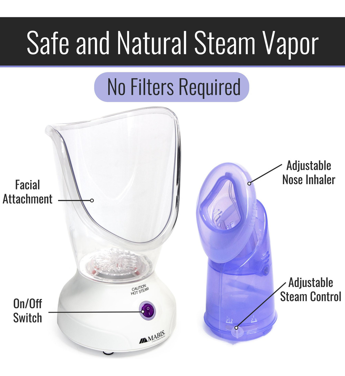 Inalador a vapor Mabis com máscara facial e nasal ajustável (FSA/HSA) – Terapia natural com inalador de vapor para alívio da sinusite, cuidados com a pele e limpeza dos poros | Umidificador vaporizador plug-in – Capacidade líquida de 60 ml – Ferramenta versátil de cuidado da pele: transforme sua rotina diária com este vaporizador facial para limpeza profunda e revitalização facial. Também é um vaporizador vocal portátil para cantores e vaporizador para sinusite. – Acessório nasal ajustável: a máquina nebulizadora portátil para adultos e crianças foi projetada para atingir áreas específicas para obter o máximo alívio. O inalador de vapor garante menos congestão nasal e promove o bem-estar respiratório – Design fácil de usar: o vaporizador a vapor foi projetado com simplicidade em mente, sem necessidade de filtros. Alterne facilmente entre o inalador de vapor facial e nasal, ajuste a intensidade e divirta-se. – O inalador de vapor não requer filtros, tem controle de vapor variável, vem com um acessório nasal ajustável, é simples de limpar e muito fácil de usar.