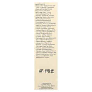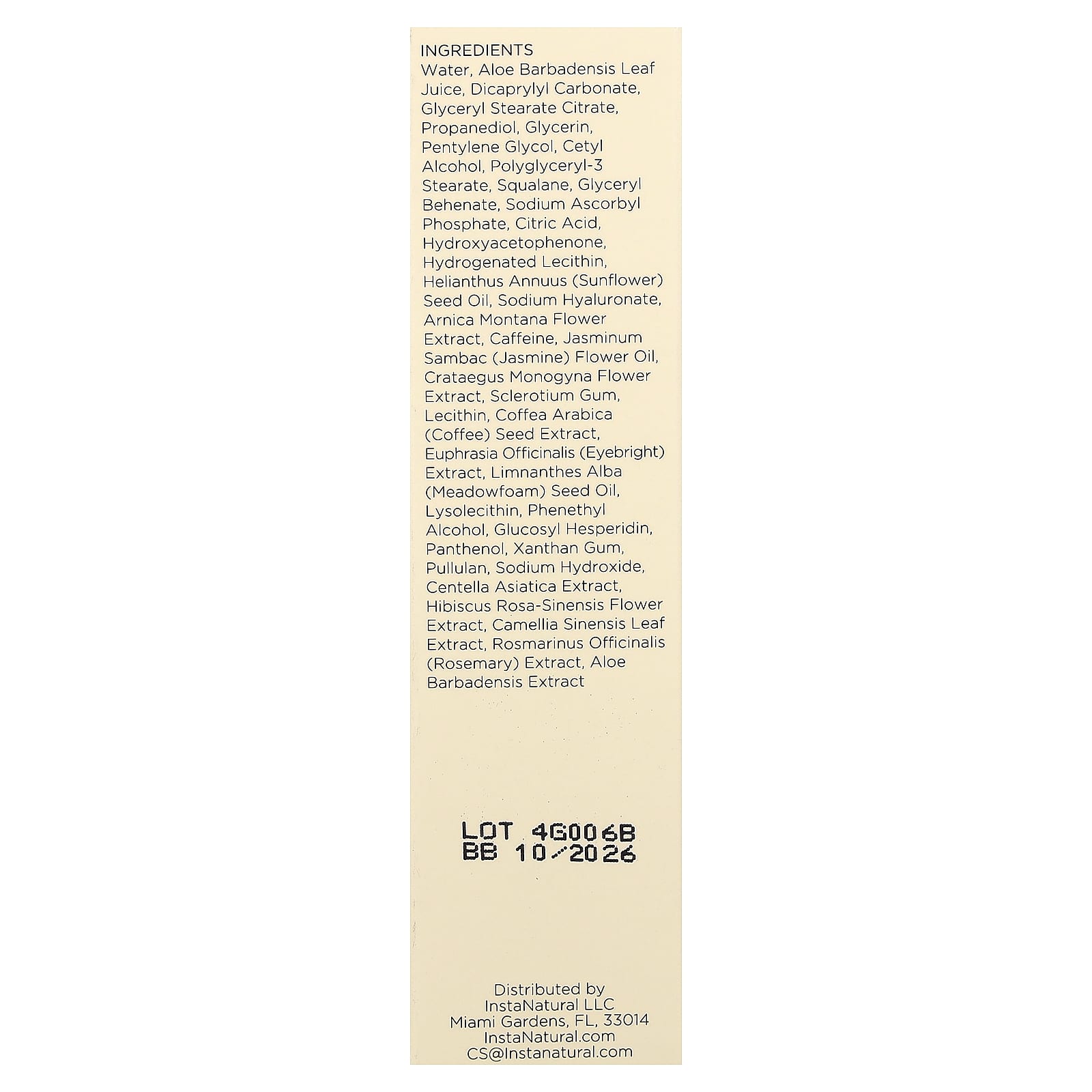 Água, suco da folha de Aloe barbadensis, dicaprylyl carbonate, citrato de monoestearato de glicerila, propanediol, glicerina, pentilenoglicol, álcool cetílico, monoestearato de poliglicerila-3, esqualano, beenato de glicerila, sodium ascorbyl phosphate, ácido cítrico, hydroxyacetophenone, lecitina hidrogenada, óleo da semente de Helianthus annuus (girassol), hialuronato de sódio, extrato da flor de Arnica montana, cafeína, óleo da flor de Jasminum sambac (jasmim), extrato da flor de Crataegus monogyna, goma de esclerócio, lecitina, extrato da semente de Coffea arabica (café), extrato de Euphrasia officinalis (eufrásia), óleo da semente de Limnanthes alba (meadowfoam), lisolecitina, álcool fenetílico, glucosyl hesperidin, pantenol, goma xantana, pullulan, hidróxido de sódio, extrato de Centella asiatica, extrato da flor de Hibiscus rosa-sinensis, extrato da folha de Camellia sinensis, extrato de Rosmarinus officinalis (alecrim), extrato de Aloe barbadensis.
