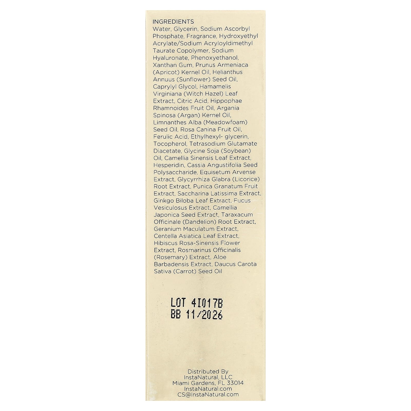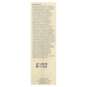 Água, glicerina, sodium ascorbyl phosphate, fragrância, copolímero de acriloildimetiltaurato de sódio e acrilato de hidroxietila, hialuronato de sódio, fenoxietanol, goma xantana, óleo da semente de Prunus armeniaca (damasco), óleo da semente de Helianthus annuus (girassol), caprylyl glycol, extrato da folha de Hamamelis virginiana (hamamélis), ácido cítrico, óleo da fruta de Hippophae rhamnoides, óleo da semente de Argania spinosa (argão), óleo da semente de Limnanthes alba (meadowfoam), óleo da fruta de Rosa canina, ferulic acid, ethylhexyl glycerin, tocoferol, tetrasodium glutamate diacetate, óleo de Glycine soja (soja), extrato da folha de Camellia sinensis, hesperidina, polissacarídeo da semente de Cassia angustifolia, extrato de Equisetum arvense, extrato da raiz de Glycyrrhiza glabra (alcaçuz), extrato da fruta de Punica granatum, extrato de Saccharina latissima, extrato da folha de Ginkgo biloba, extrato de Fucus vesiculosus, extrato da semente de Camellia japonica, extrato da raiz de Taraxacum officinale (dente-de-leão), extrato de Geranium maculatum, extrato da folha de Centella asiatica, extrato da flor de Hibiscus rosa-sinensis, extrato de Rosmarinus officinalis (alecrim), extrato de Aloe barbadensis, óleo da semente de Daucus carota sativa (cenoura).