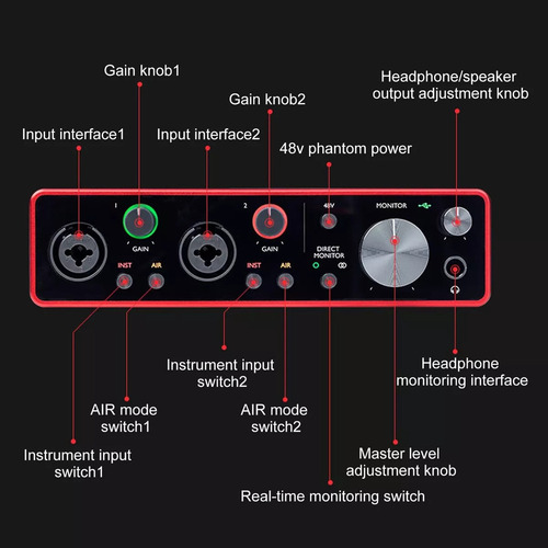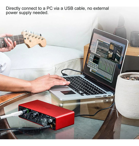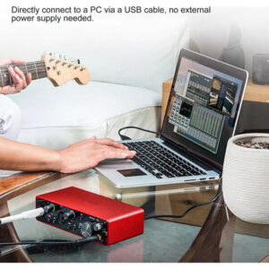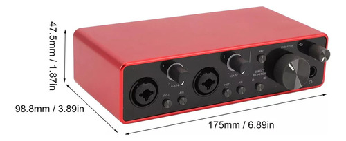 suportes Potência fantasma de 48V Quantidade de entrada do instrumento: 2 Quantidade de entrada de linha: 2 Quantidade de saída analógica: 2TRS Balanceada Quantidade de saída de fone de ouvido: 1 Compatível: para Win 7 10 11, para OS X 10.1 e superior