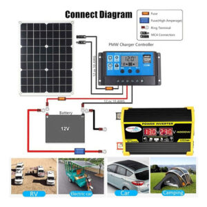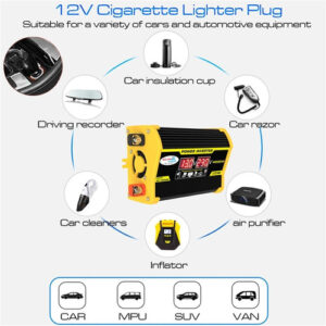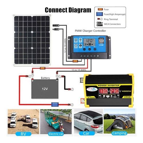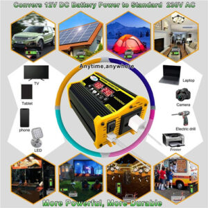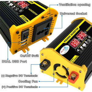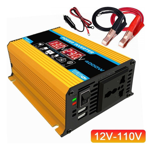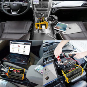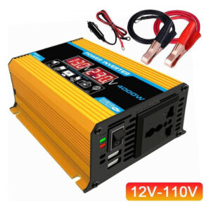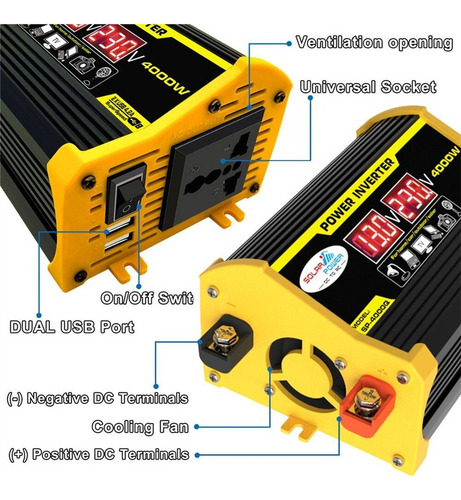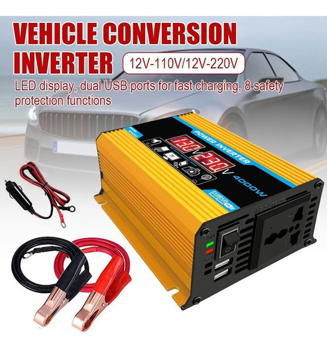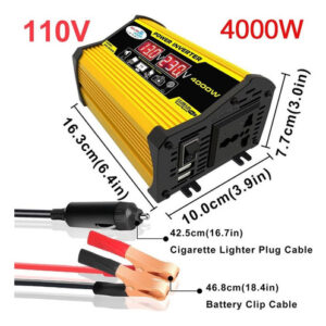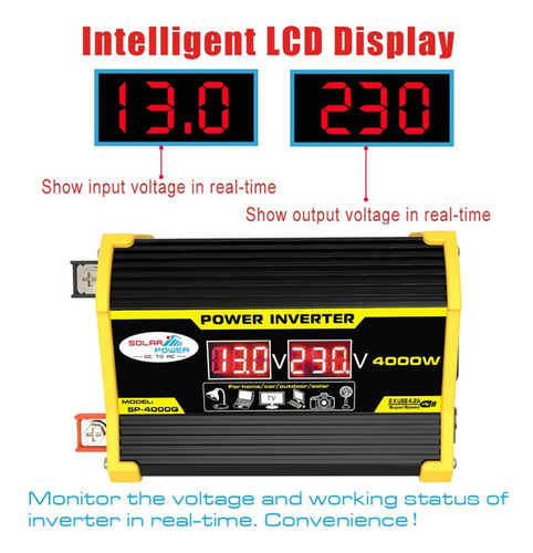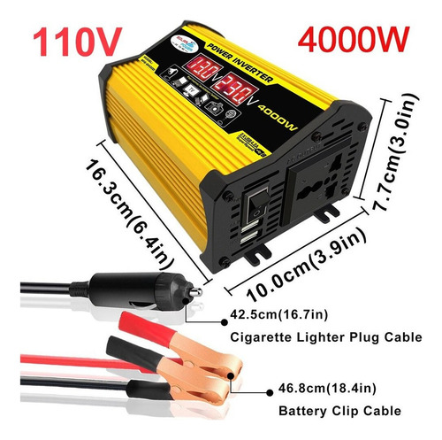 Descrição: 1. Tela LCD: A tela LCD mostra a tensão de entrada e a tensão de saída da bateria. O cabo de ignição pode alimentar facilmente o dispositivo. Se a potência de saída exceder 200 W, use clipes de jacaré para conectar a bateria. 2. Inversor de pico de 4000 W: inversor de energia para carro com 2 portas USB e saídas AC. O inversor fornece 300 W de potência contínua e 4000 W de potência máxima (certifique-se de que a potência nominal total dos dispositivos conectados seja
