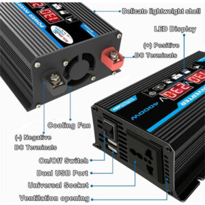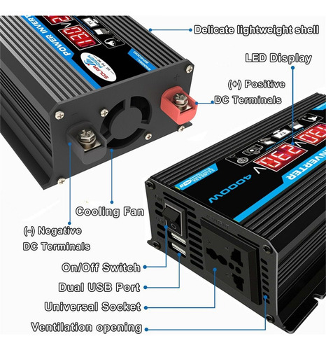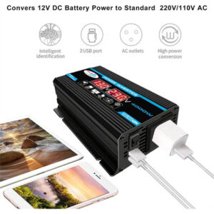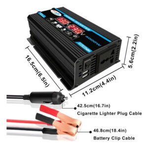 2. Inversor de pico de 4000 W: inversor de energia para carro com 2 portas USB e tomadas AC. O inversor fornece 300 W de potência contínua e 4000 W de potência máxima (certifique-se de que a potência nominal total dos dispositivos conectados seja de 300 W).