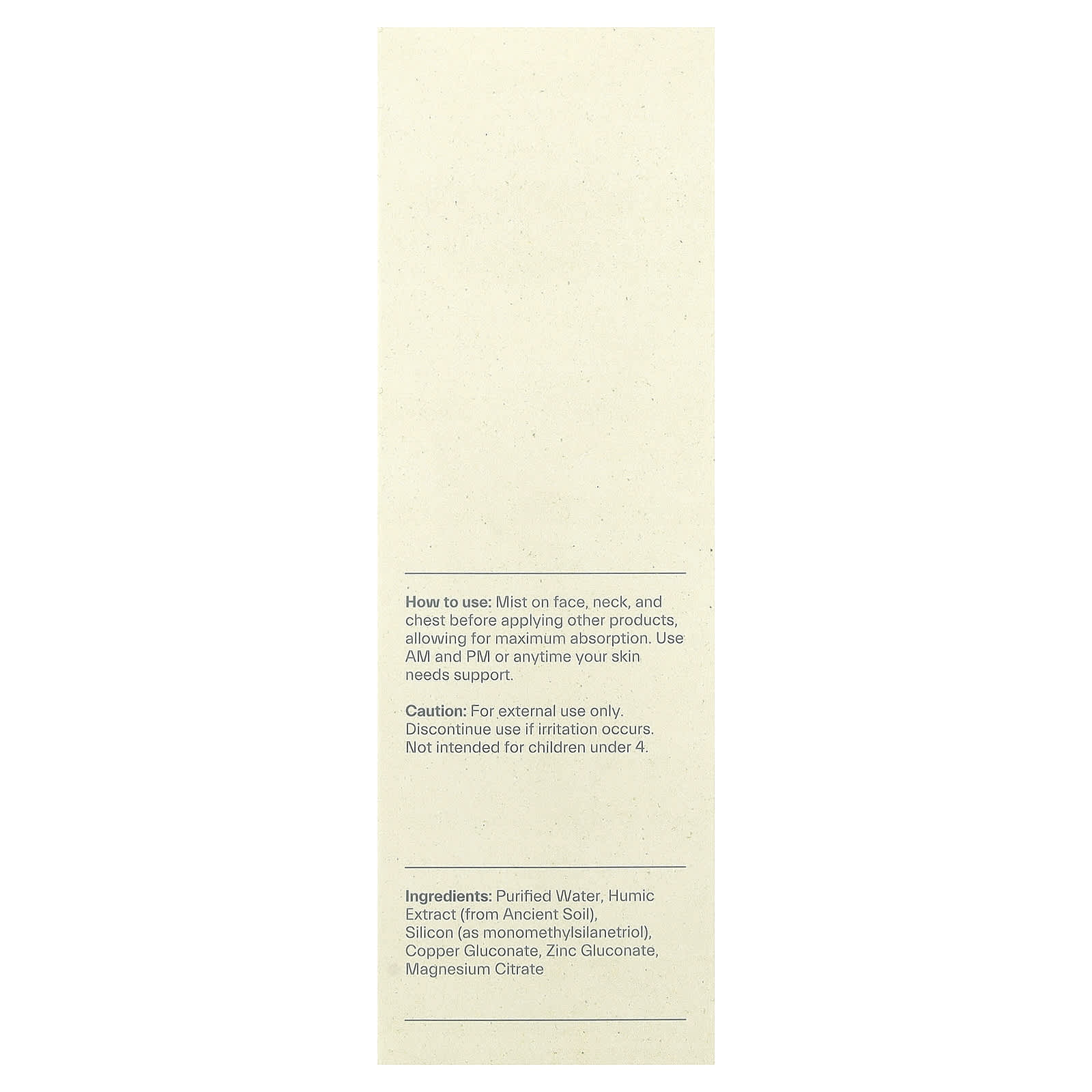 Água purificada, extrato húmico (de solo antigo), silício (como Monomethylsilanetriol), gliconato de cobre, gliconato de zinco, citrato de magnésio.