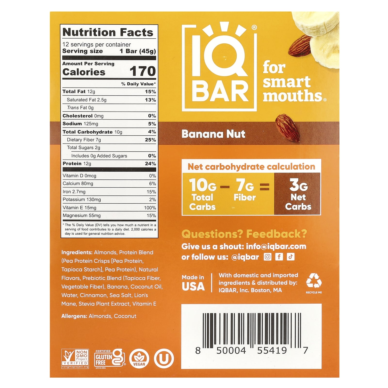 Amêndoas, mistura de proteínas (biscoitos de proteína de ervilha [proteína de ervilha, amido de tapioca], proteína de ervilha), sabores naturais, mistura prebiótica (fibra de tapioca, fibra vegetal), banana, óleo de coco, água, canela, sal marinho, juba-de-leão, extrato da planta de estévia, vitamina E.