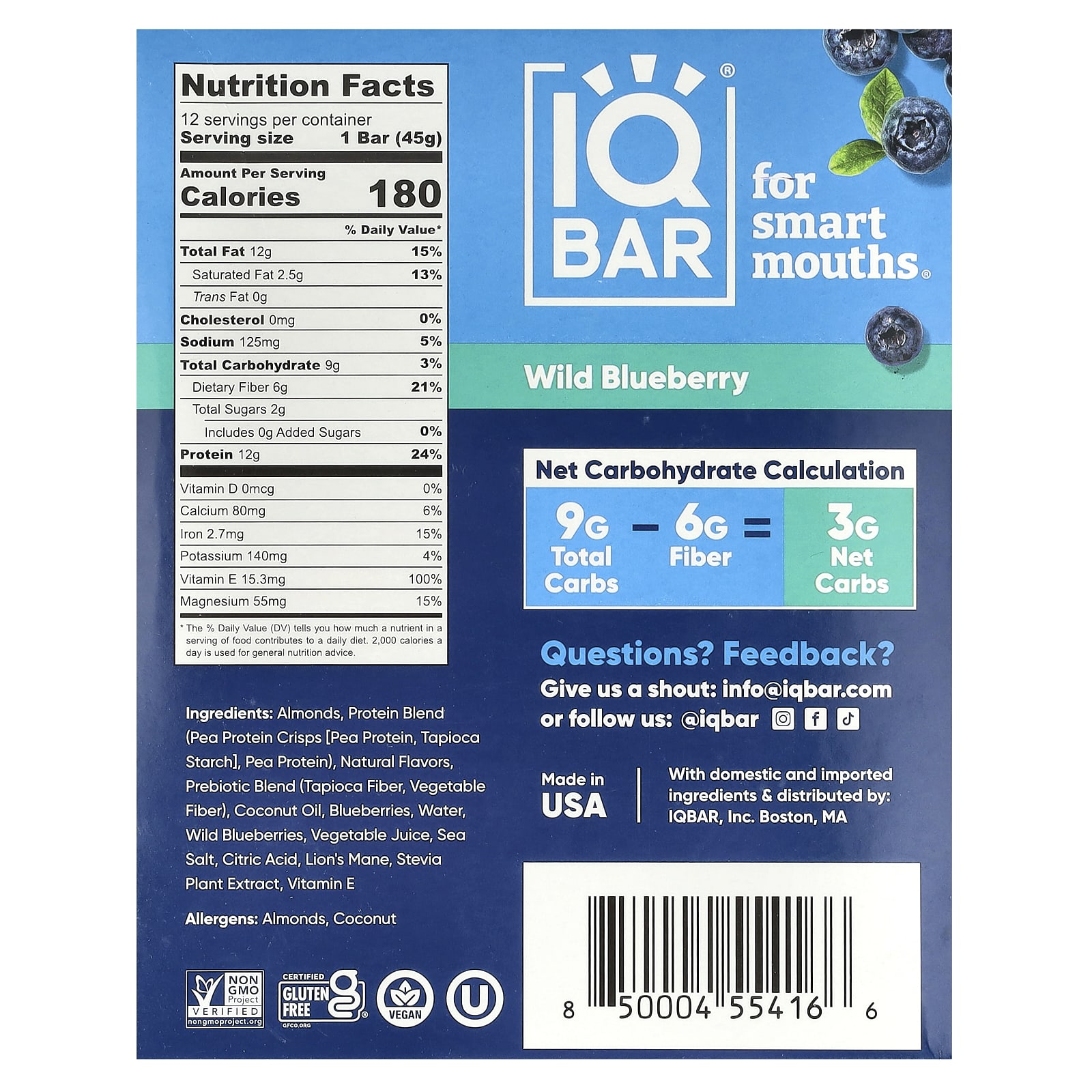 Amêndoas, mistura de proteínas (biscoitos de proteína de ervilha [proteína de ervilha, amido de tapioca], proteína de ervilha), sabores naturais, mistura prebiótica (fibra de tapioca, fibra vegetal), óleo de coco, mirtilos, água, mirtilos silvestres, suco de vegetais, sal marinho, ácido cítrico, juba-de-leão, extrato da planta de estévia, vitamina E.