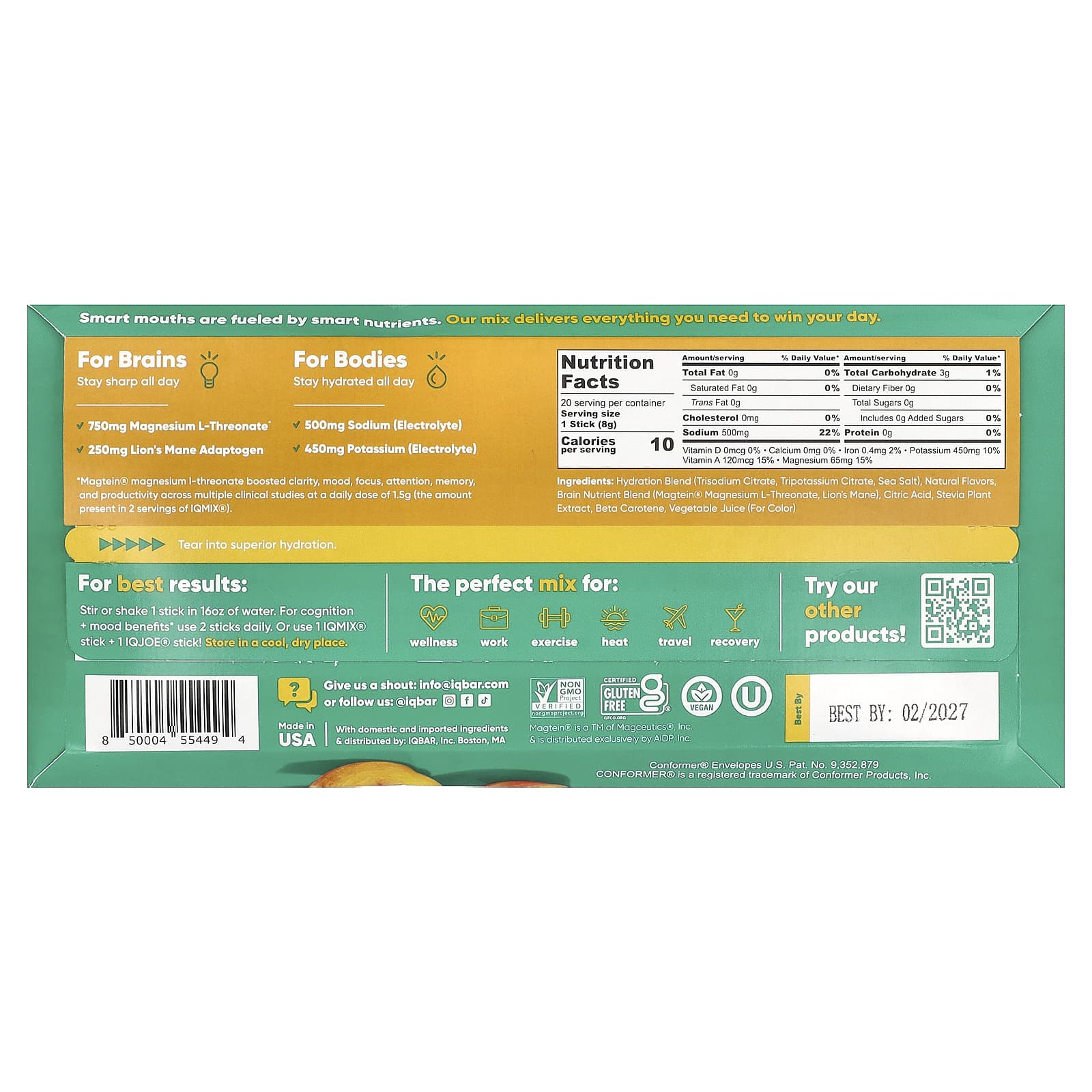 IQBAR IQMIX® Mistura de Hidratação + Clareza + Humor Pêssego e Manga 20 Bastões 8 g (028 oz) Cada – IQBAR Nutrição Esportiva Hidratação e Eletrólitos.
