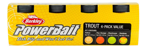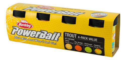Isca de massa de truta Berkley PowerBait, 4 unidades — Moldável e fácil de usar — A fórmula flutuante melhora a dispersão do aroma e do sabor da Power Bait — O pacote com 4 inclui: Chartreuse, RAINBOW, laranja fluorescente e amarelo — Controle de temperatura ajustável com regulador duplo de baixo perfil