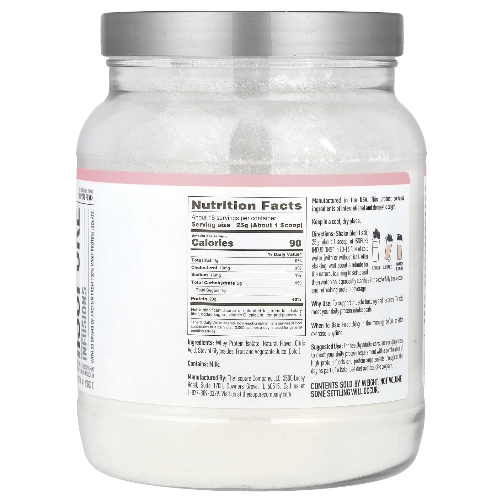 ISOPURE INFUSIONS ”não é a sua típica proteína em pó semelhante ao milkshake. É uma experiência refrescante e leve com sabor de frutas que fornece a proteína que você deseja, sem todos os ingredientes desnecessários que você não deseja. Dê um batido vigoroso de ISOPURE INFUSIONS e observe 20 gramas de proteína whey isolada 100% infundida em uma bebida refrescante e colorida, bem diante de seus olhos. E o que você vê é o que você obtém: 5 ingredientes, sem gordura ou adição de açúcares ** e apenas 90 calorias ** por colher medidora. Feito com sabores naturais de abacaxi, melancia e manga e adoçado apenas com extrato da folha de estévia. Simples, poderoso e delicioso.