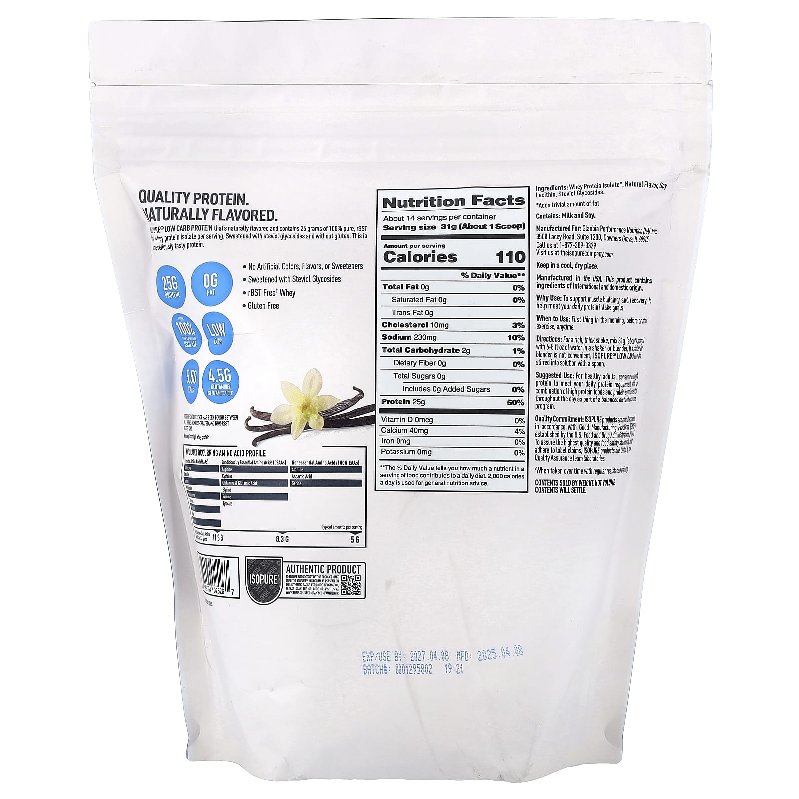 Proteína Low Carb Isopure® que tem sabor natural e contém 25 gramas de isolado de proteína whey 100% puro e sem rBST† por porção. Adoçado com glicosídeos de esteviol e sem glúten. Esta é uma proteína muito saborosa.