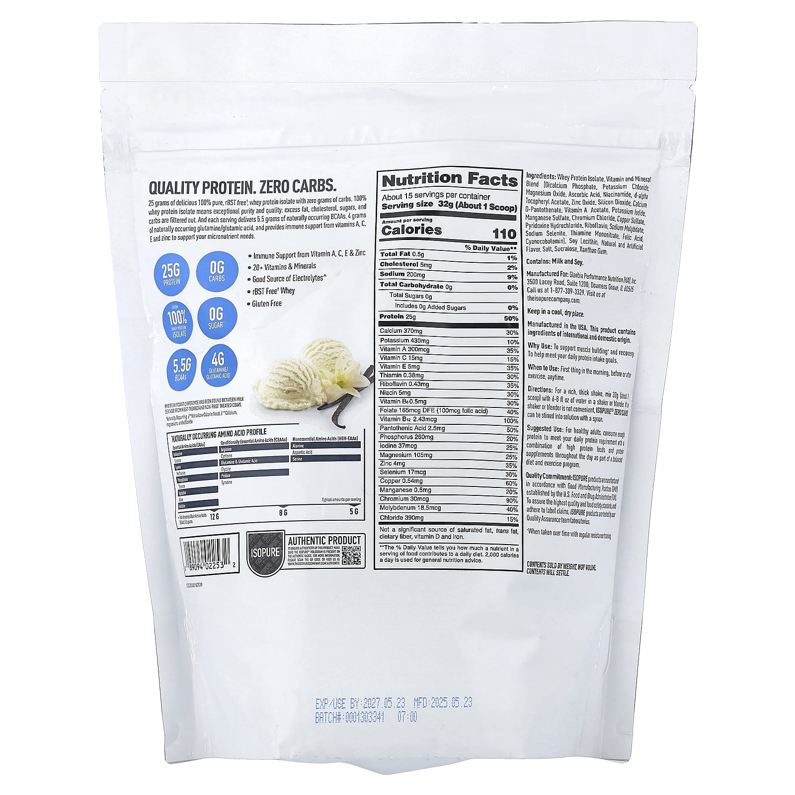 25 gramas de isolado de proteína whey delicioso, 100% puro e sem rBST†, sem gramas de carboidratos. 100% de isolado de proteína whey significa pureza e qualidade excepcionais: o excesso de gordura, colesterol, açúcares e carboidratos é filtrado. E cada porção fornece 5,5 gramas de BCAAs de ocorrência natural, 4 gramas de glutamina/ácido glutâmico de ocorrência natural e fornece suporte imunológico das vitaminas A, C, E e zinco para atender às suas necessidades de micronutrientes.