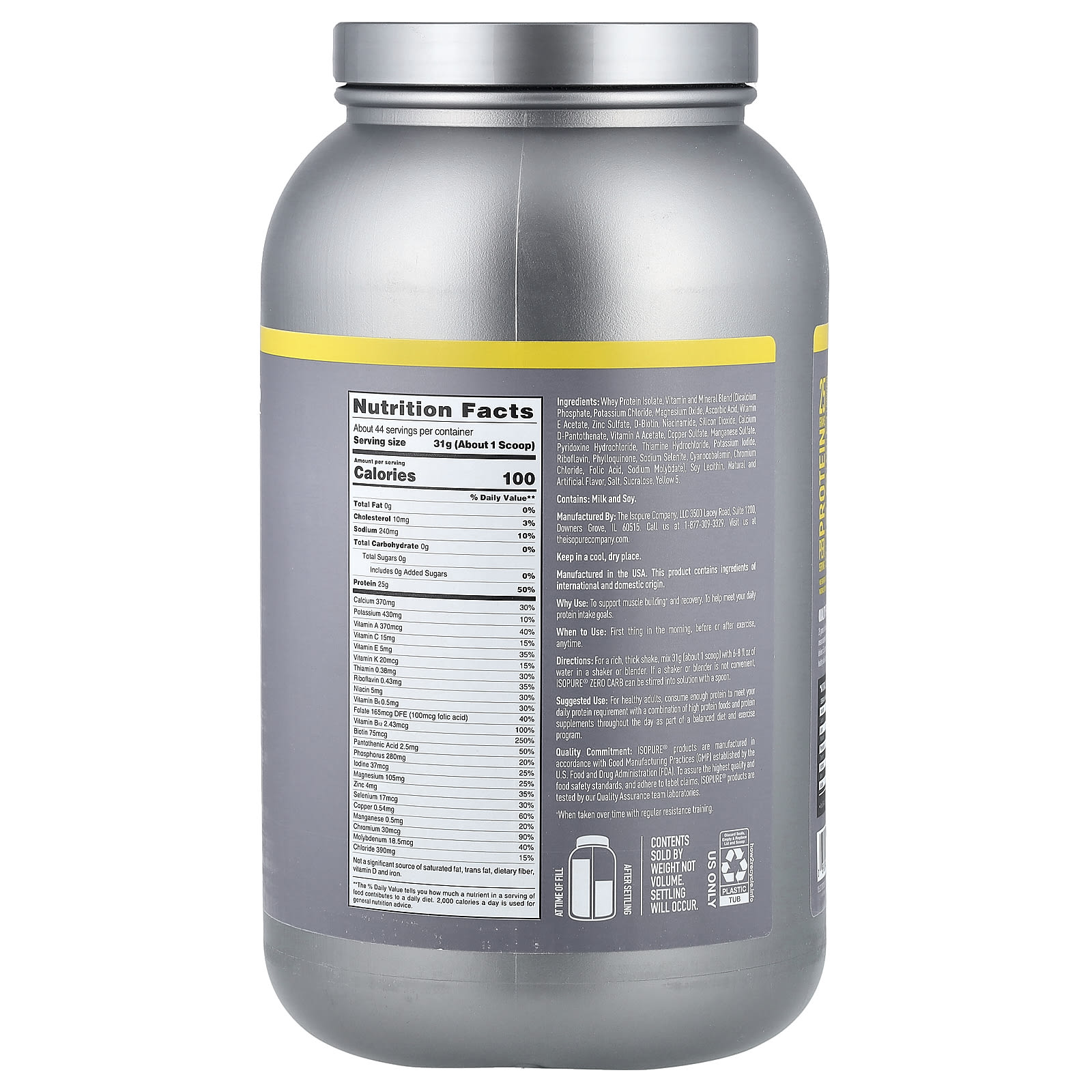 25 gramas de isolado de proteína whey delicioso, 100% puro e sem rBST†, sem gramas de carboidratos. 100% de isolado de proteína whey significa pureza e qualidade excepcionais: o excesso de gordura, colesterol, açúcares, carboidratos e lactose é filtrado. E cada porção fornece 5,5 gramas de BCAAs de ocorrência natural, 4 gramas de glutamina de ocorrência natural, 75 mcg de biotina para promover pele e unhas saudáveis e vitaminas A, C, E e Zinco para suporte imunológico.