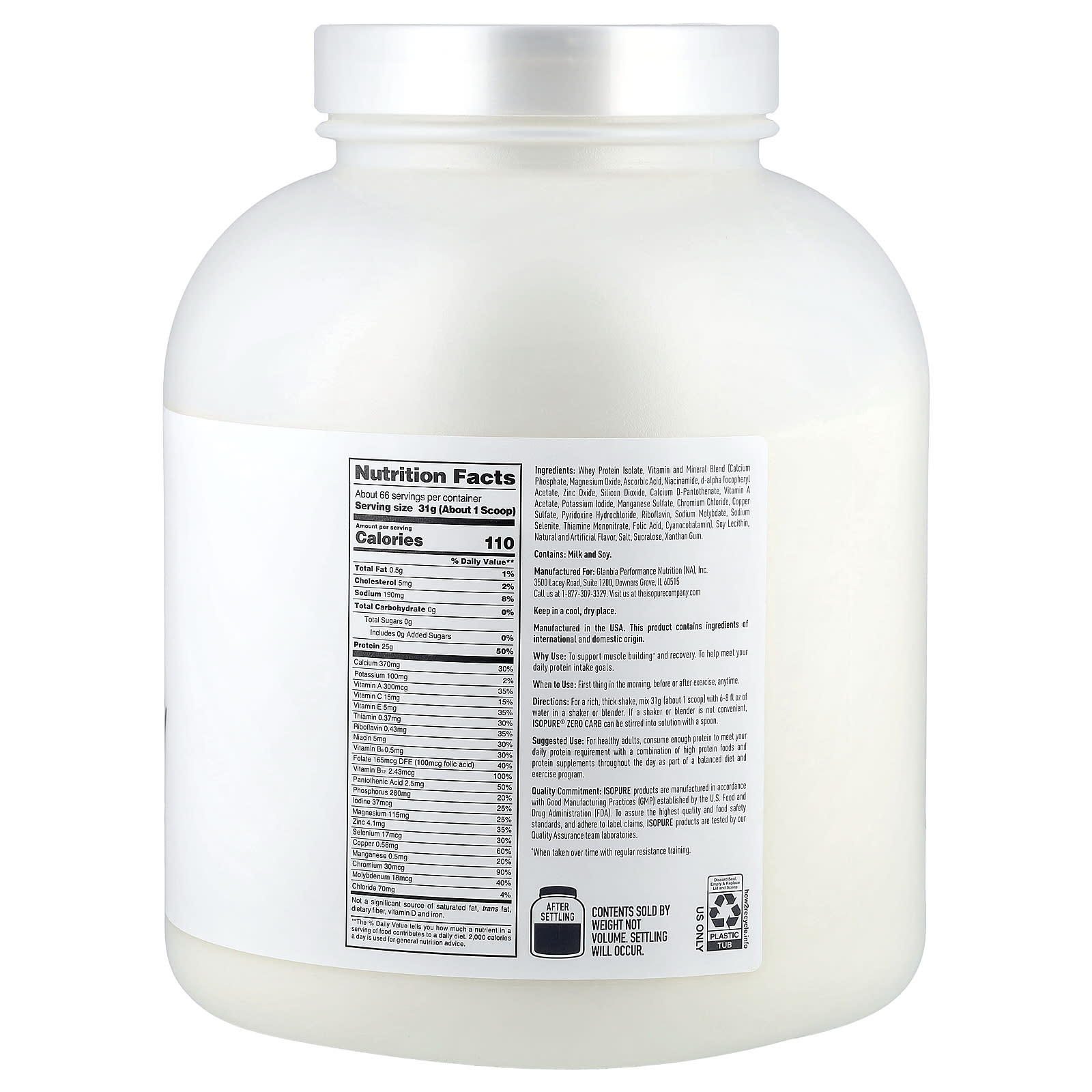 25 gramas de isolado de whey protein delicioso, 100% puro e sem rBST†, com zero grama de carboidratos. 100% de isolado de proteína whey significa pureza e qualidade excepcionais: o excesso de gordura, colesterol, açúcares e carboidratos é filtrado. E cada porção fornece 5,5 gramas de BCAAs de ocorrência natural, 4 gramas de glutamina/ácido glutâmico de ocorrência natural e fornece suporte imunológico com vitaminas A, C e E e zinco para atender às suas necessidades de micronutrientes