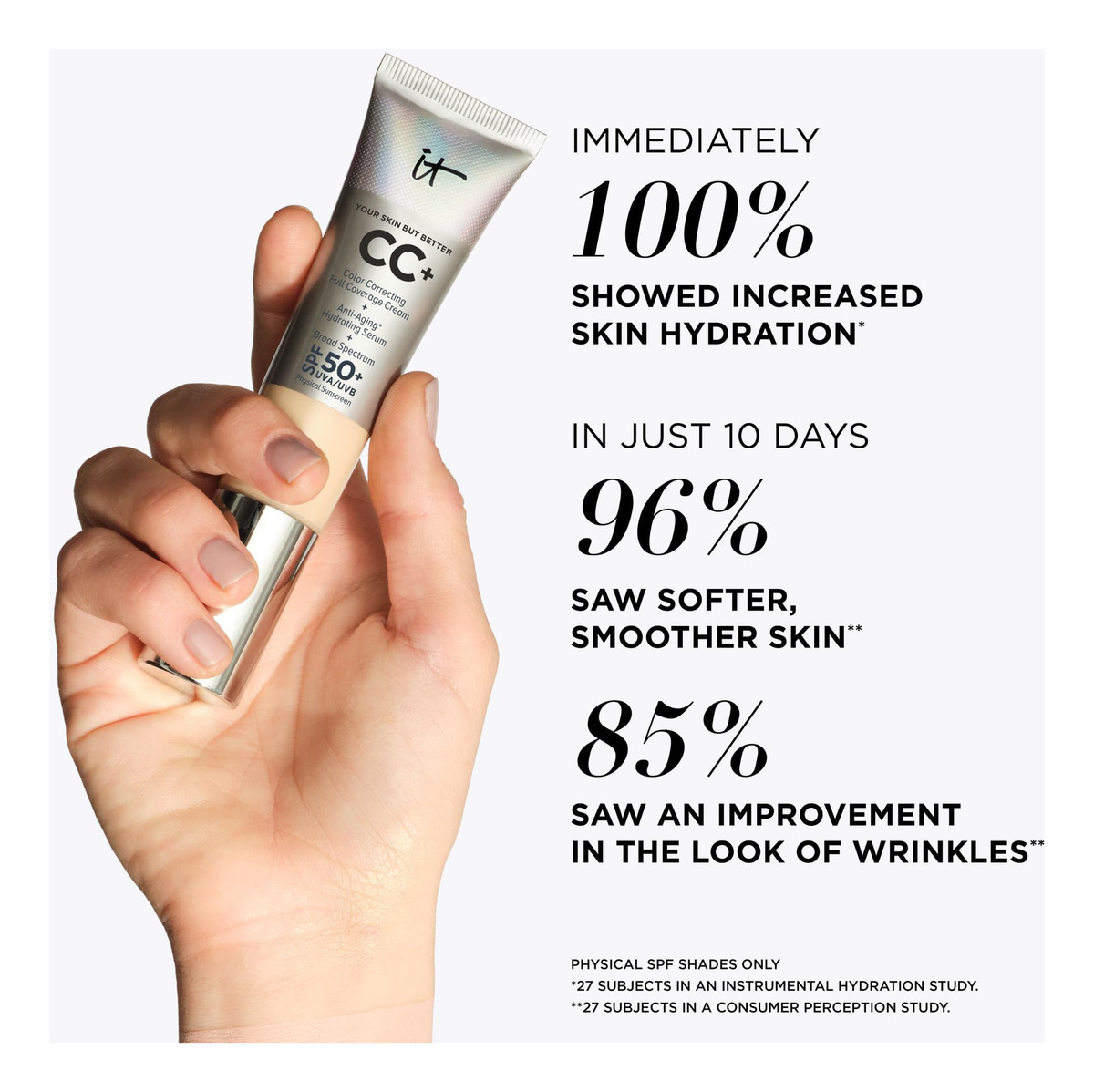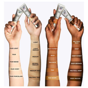 • FUNCIONA REALMENTE – A IT Cosmetics agora oferece uma gama de opções de ingredientes com FPS, tanto físicos quanto transparentes. Para podermos ampliar a nossa gama de tonalidades, trabalhámos com cirurgiões plásticos e dermatologistas para introduzir FPS 50+ transparente nas nossas novas tonalidades mais profundas.