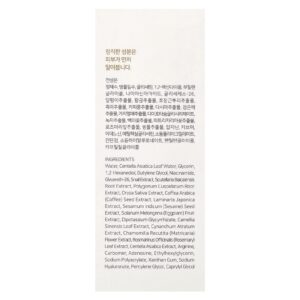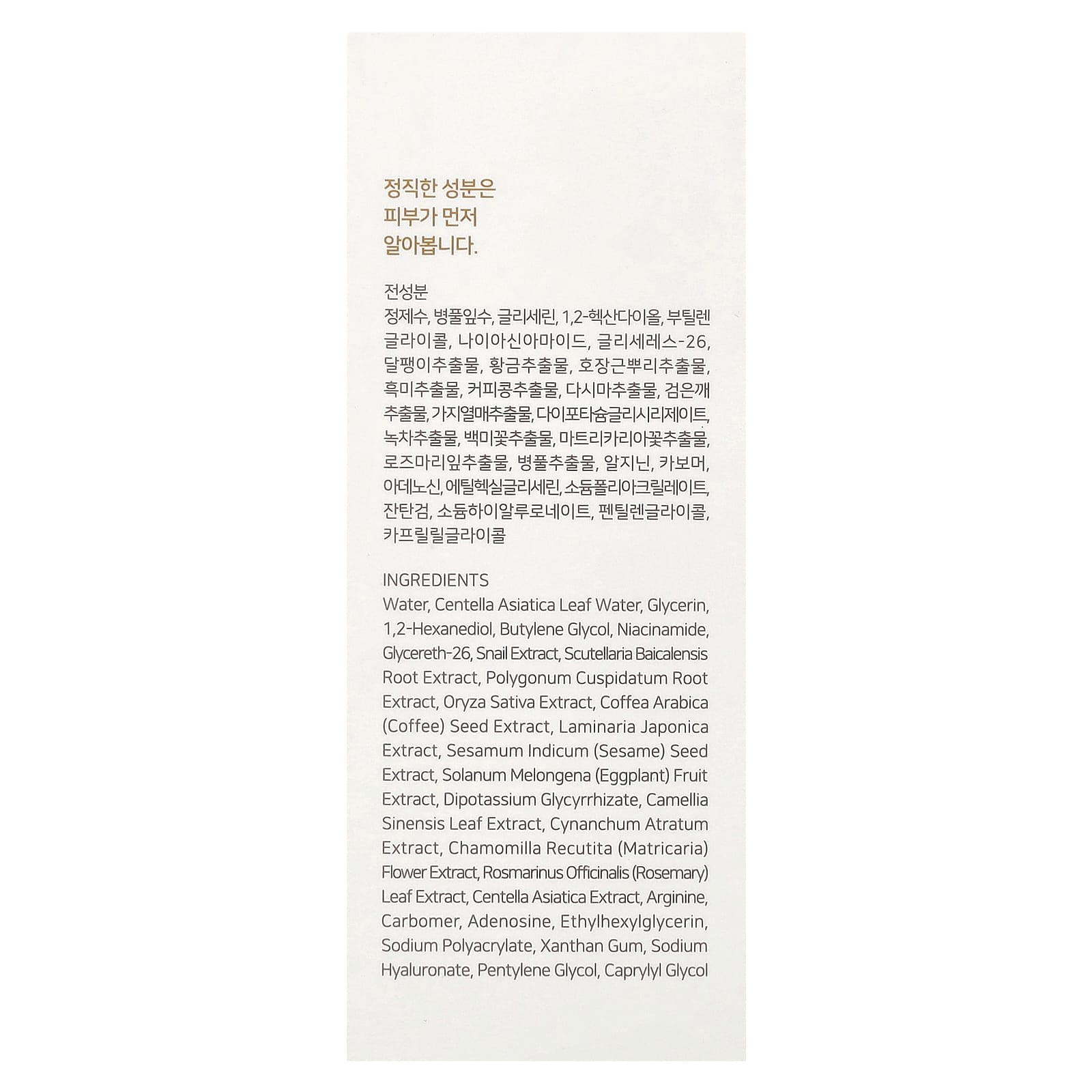 Água, água da folha de Centella asiatica, glicerina, 1,2-hexanediol, butilenoglicol, nicotinamida, glycereth-26, extrato de caracol, extrato da raiz de Scutellaria baicalensis, extrato da raiz de Polygonum cuspidatum, extrato de Oryza sativa, extrato da semente de Coffea arabica (café), extrato de Laminaria japonica, extrato da semente de Sesamum indicum (gergelim), extrato da fruta de Solanum melongena (berinjela), dipotassium glycyrrhizate, extrato da folha de Camellia sinensis, extrato de Cynanchum atratum, extrato da flor de Chamomilla recutita (matricária), extrato da folha de Rosmarinus officinalis (alecrim), extrato de Centella asiatica, arginina, carbômero, adenosina, ethylhexylglycerin, sodium polyacrylate, goma xantana, hialuronato de sódio, pentilenoglicol, caprylyl glycol.