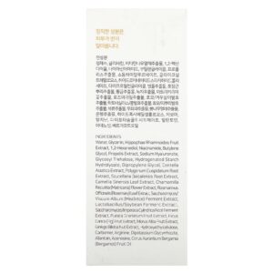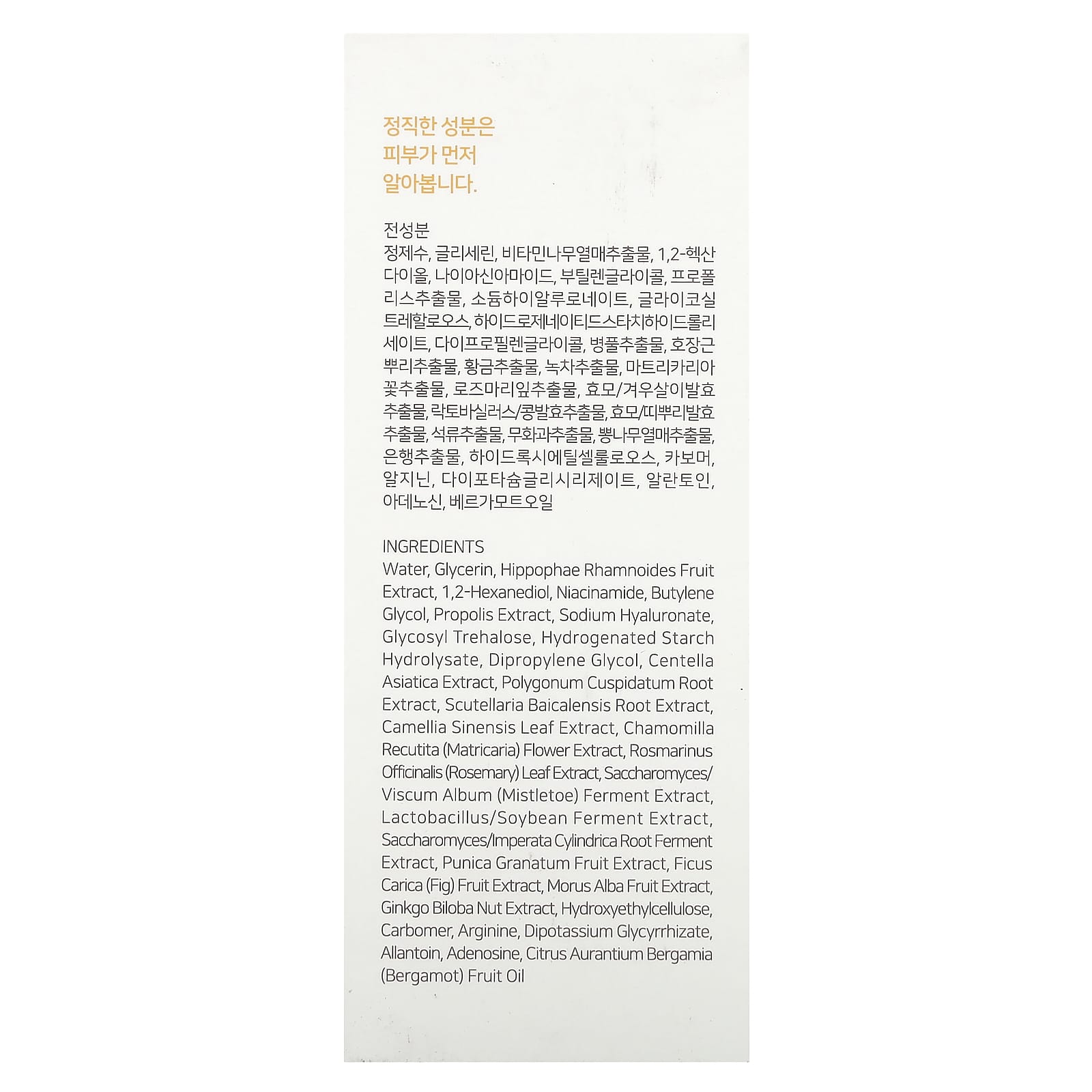 Água, glicerina, extrato da fruta de Hippophae rhamnoides, 1,2-hexanediol, nicotinamida, butilenoglicol, extrato de própolis, hialuronato de sódio, glicosil trealose, hidrolisado de amido hidrogenado, dimetildietilenoglicol, extrato de Centella asiatica, extrato da raiz de Polygonum cuspidatum, extrato da raiz de Scutellaria baicalensis, extrato da folha de Camellia sinensis, extrato da flor de Chamomilla recutita (matricária), extrato da folha de Rosmarinus officinalis (alecrim), extrato de fermentação de Viscum album (visco)/Saccharomyces, extrato de fermentação de soja/lactobacillus, extrato de fermentação da raiz de Imperata cylindrica/Saccharomyces, extrato da fruta de Punica granatum, extrato da fruta de Ficus carica (figo), extrato da fruta de Morus alba, extrato de Ginkgo biloba, hietelose, carbômero, arginina, dipotassium glycyrrhizate, alantoína, adenosina, óleo da fruta de Citrus aurantium bergamia (bergamota).