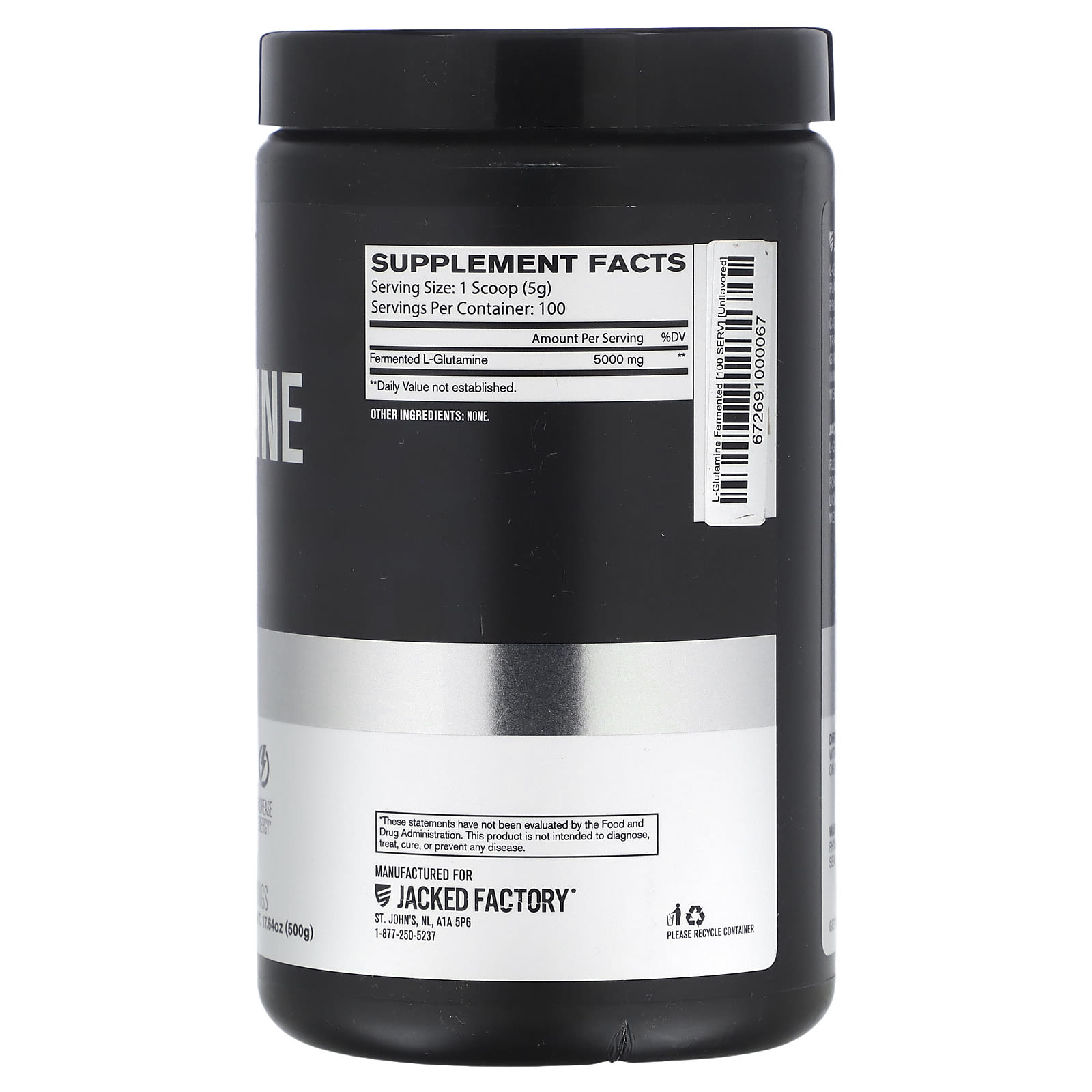 A Jacked Factory L-Glutamine fornece 5.000 mg de L-glutamina pura em cada colher medidora. Sem excipientes, aglutinantes, agentes de fluxo ou ingredientes artificiais de qualquer tipo. Esta fórmula não tem sabor e é facilmente solúvel em praticamente qualquer líquido, para que você possa adicioná-la aos seus suplementos em pó favoritos, smoothies e shakes proteicos com facilidade.