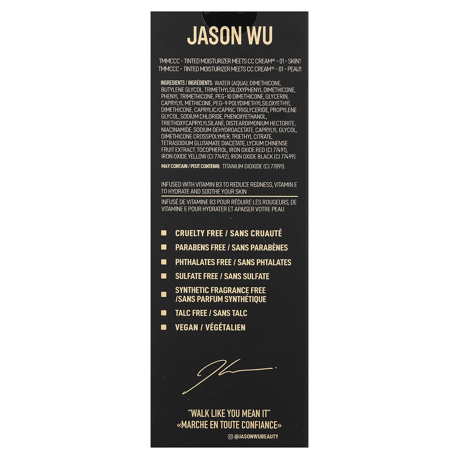 Água, dimeticona, butilenoglicol, trimetilsiloxifenil dimeticona, phenyl trimethicone, peg-10 dimeticona, glicerina, caprylyl methicone, peg-9 polydimethylsiloxyethyl dimethicone, caprylic/capric triglyceride, propilenoglicol, cloreto de sódio, fenoxietanol, triethoxycaprylylsilane, disteardimonium hectorite, nicotinamida, sodium dehydroacetate, caprylyl glycol, crospolímero de dimeticona, citrato de trietila, tetrasodium glutamate diacetate, extrato da fruta de Lycium chinense, tocoferol, vermelho óxido de ferro (CI 77491), amarelo de óxido de ferro (CI 77492), óxido de ferro preto (CI 77499).