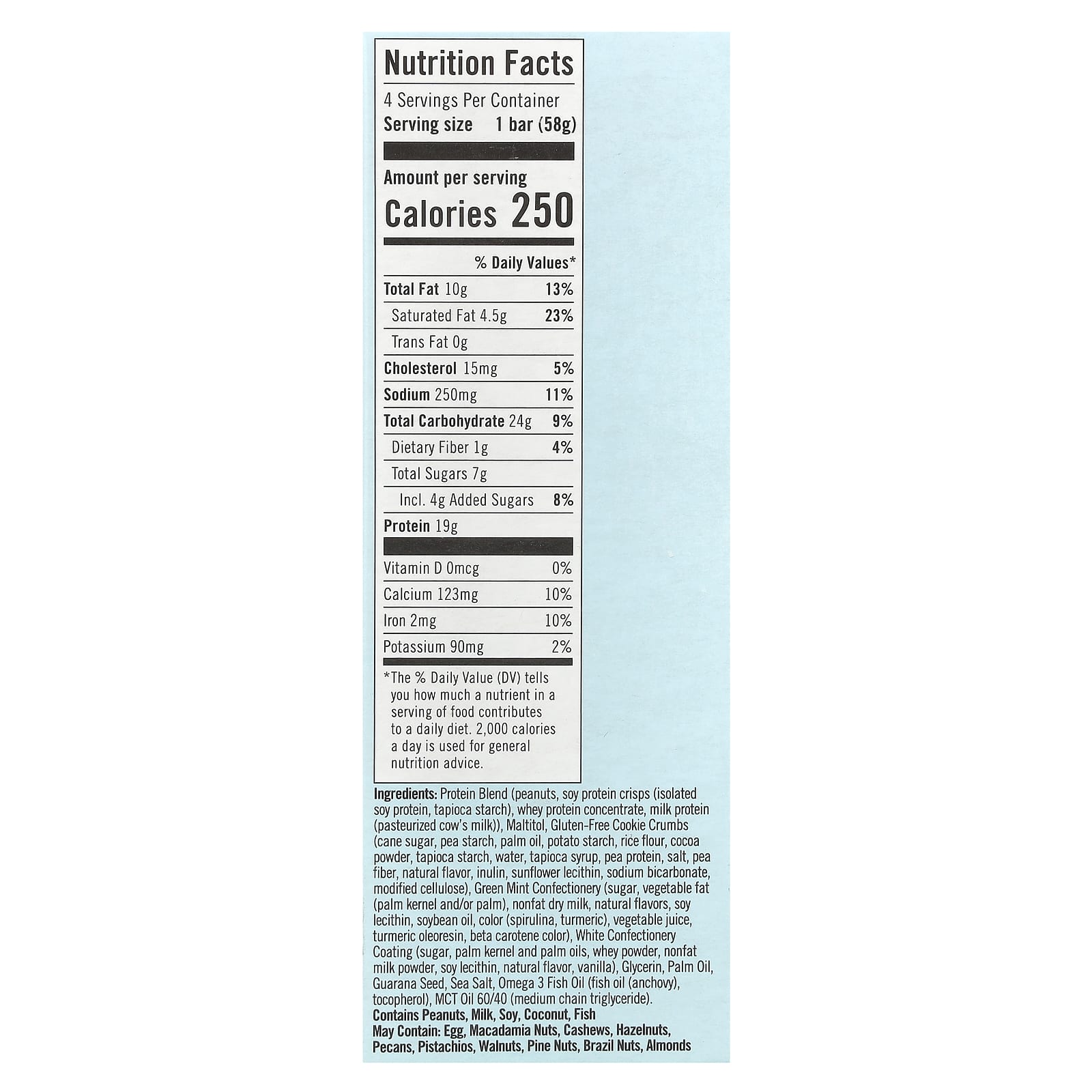 Mistura de proteínas (amêndoa, pedaços de proteína de soja (proteína de soja isolada, amido de tapioca), concentrado de proteína whey, proteína do leite (leite de vaca pasteurizado), maltitol, pedaços de biscoitos sem glúten (açúcar de cana, amido de ervilha, óleo de palma, amido de batata, farinha de arroz, cacau em pó, amido de tapioca, água, xarope de tapioca, proteína de ervilha, sal, fibra de ervilha, sabor natural, inulina, lecitina de girassol, bicarbonato de sódio, celulose modificada), confeitaria de menta verde (açúcar, gordura vegetal (palmiste e/ou palma), leite desidratado sem gordura (desnatado), sabores naturais, lecitina de soja, óleo de soja, corantes (espirulina, cúrcuma), suco de vegetais, oleorresina de cúrcuma, corante betacaroteno), cobertura branca de confeitaria (açúcar, palmiste e óleos de palma, whey em pó, leite em pó desnatado, lecitina de soja, sabor natural, baunilha), glicerina, óleo de palma, semente de guaraná, sal marinho, óleo de peixe ômega-3 (óleo de peixe (anchova), tocoferol), óleo TCM 60/40 (triglicerídeo de cadeia média).