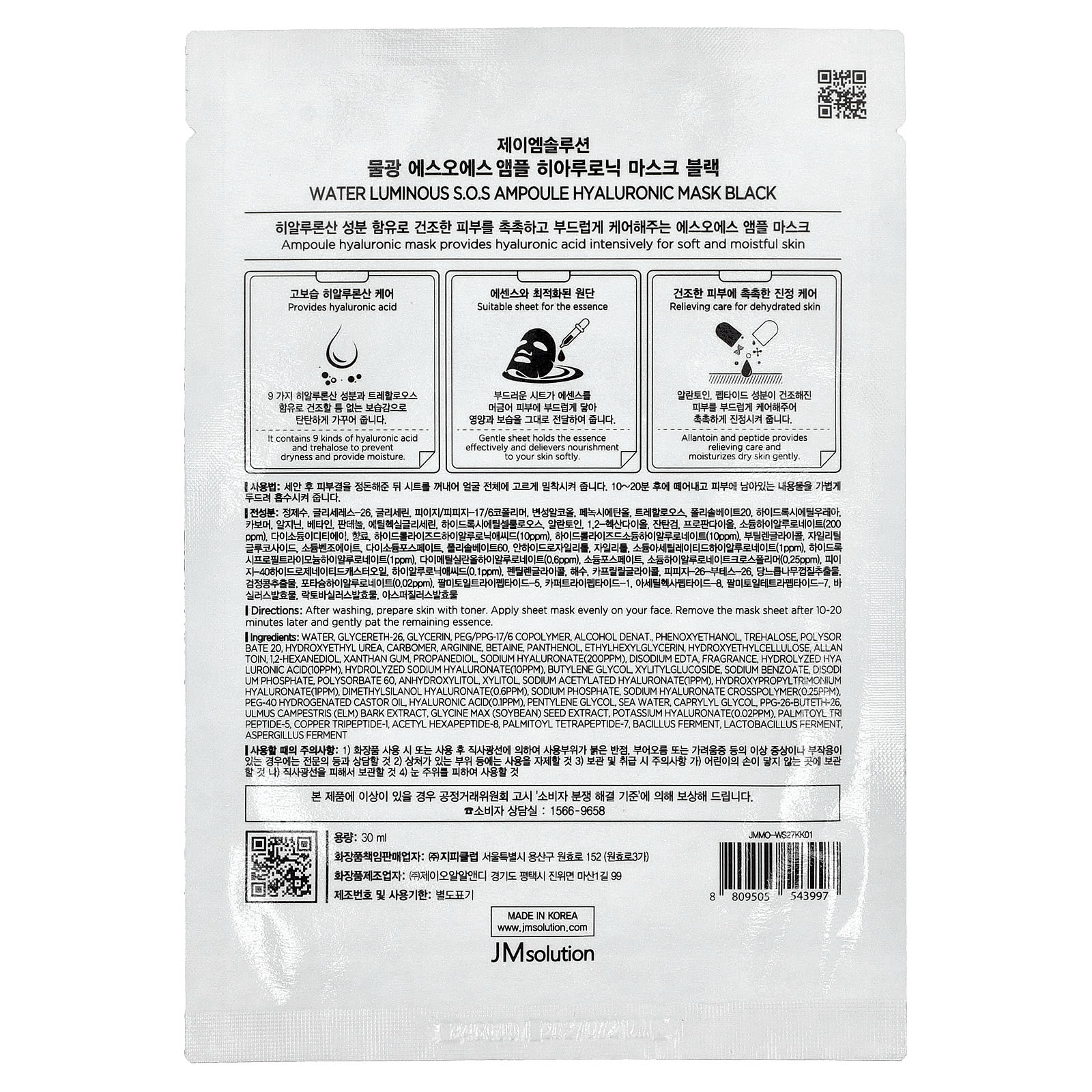 JM Solution Água Luminosa SOS Ampola Máscara de Beleza Hialurônica Preta 1 Unidade 30 ml – JM Solution Beleza Máscaras Faciais de Beleza Máscaras Faciais Máscaras em folha K-Beauty.
