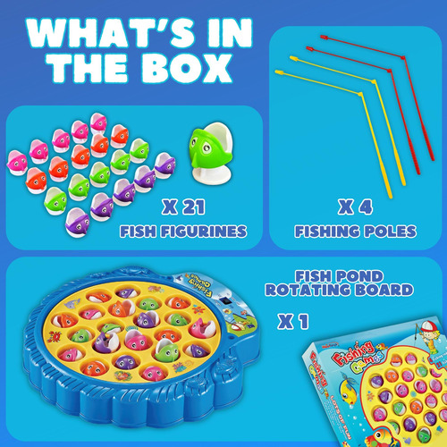 Experimente a nostalgia com um toque moderno O clássico jogo de pesca Volte no tempo com uma nova versão de um favorito da infância! Nosso clássico jogo de pesca interativo traz a alegria e a emoção da diversão de pesca em ritmo acelerado direto para sua casa. Perfeito para noites de jogos em família ou para jogar sozinho, este adorado jogo foi projetado para cativar as crianças e trazer de volta boas lembranças para os pais. Além de oferecer horas de entretenimento, também promove a coordenação olho-mão e as habilidades motoras em crianças pequenas. Especificações e características: Dimensões do viveiro de peixes do tabuleiro de jogo: 10,5 x 10,5 x 1,5 polegadas Dimensões da embalagem: 11 x 11 x 2 polegadas; Peso: 1 kg Jogo de pesca de ação rápida! Pronto, pronto, vá! Pratique habilidades de pesca com este jogo clássico! Música/som podem ser desligados para brincadeiras mais silenciosas Os exercícios de percepção visual ajudam no reconhecimento de cores e melhoram os reflexos Ajuda as crianças a desenvolver a coordenação olho-mão Excelente para demonstrar a terceira lei do movimento de Newton Feito de materiais de alta qualidade, seguros, duráveis e não tóxicos, de acordo com os padrões internacionais de saúde e segurança. Para 1 a 4 jogadores, varas/varas de pesca adicionais/substitutas disponíveis no ASIN B07BRFQ8ZV Conjunto de peixes adicional/substituto disponível na ASIN B07BRFQ8ZV. IN B07FTSXBM9 Use baterias novas de boa qualidade para um desempenho ideal Nota: Siga precauções de segurança no manual do produto e/ou na embalagem do produto Conteúdo do pacote: 1 x Game Board Fishpond 4 x vara de pesca não magnética 21 x peixe não magnético necessário: 2 pilhas AA de 1,5 V (NÃO incluídas) Por que Haktoys? A HAK Toys defende todos os produtos que oferece, garantindo que atendam aos rígidos padrões de qualidade. Se o produto não atender às suas expectativas, garantiremos o correto! – Compacto e conveniente: o viveiro de peixes do tabuleiro de jogos mede 10,5 x 10,5 x 1,5 polegadas, tornando-o o tamanho perfeito para jogar na mesa. As dimensões da embalagem são 11 x 11 x 2 polegadas, com um peso total de apenas 1 kg, facilitando o armazenamento e o transporte. – PEÇAS ADICIONAIS DISPONÍVEIS: Precisa de varas de pesca ou peixes extras? Para mais varas de pesca, pesquise o ASIN B07BRFQ8ZV e, para conjuntos de peixes extras, pesquise o ASIN B07FTSXBM9 na barra de pesquisa da Amazon. – Quadro giratório com botão liga/desliga música: envolve crianças com uma prancha giratória motorizada e permite brincadeiras silenciosas quando necessário. – Diversão multijogador empolgante: inclui 21 peixes coloridos e 4 varas de pescar, tornando-a ideal para 1 a 4 jogadores, perfeita para noites de jogos em família ou em grupo jogue. – Jogo multijogador de pesca de ação rápida para 1-4 jogadores. Inclui tabuleiro de jogo giratório motorizado, 4 varas de pesca não magnéticas e 21 peixes.