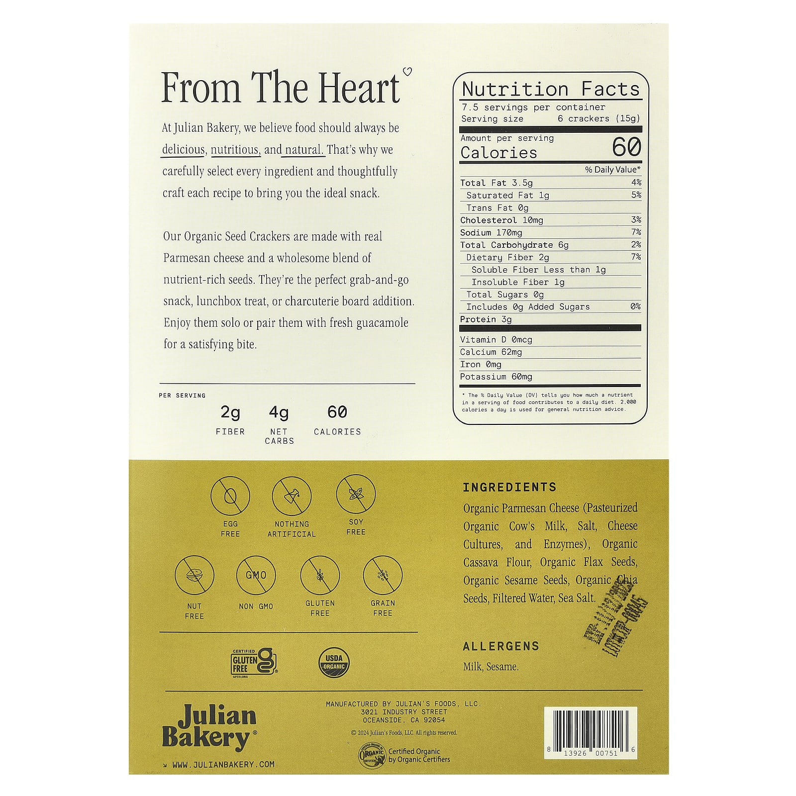 Julian Bakery Biscoitos de Semente Orgânicos Parmesão 113 g (4 oz) – Julian Bakery Alimentos Petiscos e lanches Biscoitos salgados.