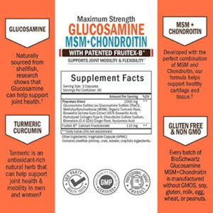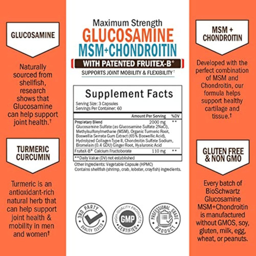 Glucosamina – MSM + Condroitina MSM com Cúrcuma, para alívio de dores nas ancas, articulações e costas. Suplemento antiinflamatório com ácido hialurônico, colágeno, boswellia, bromelaína e Fruitex-B. Sem glúten e sem OGM.