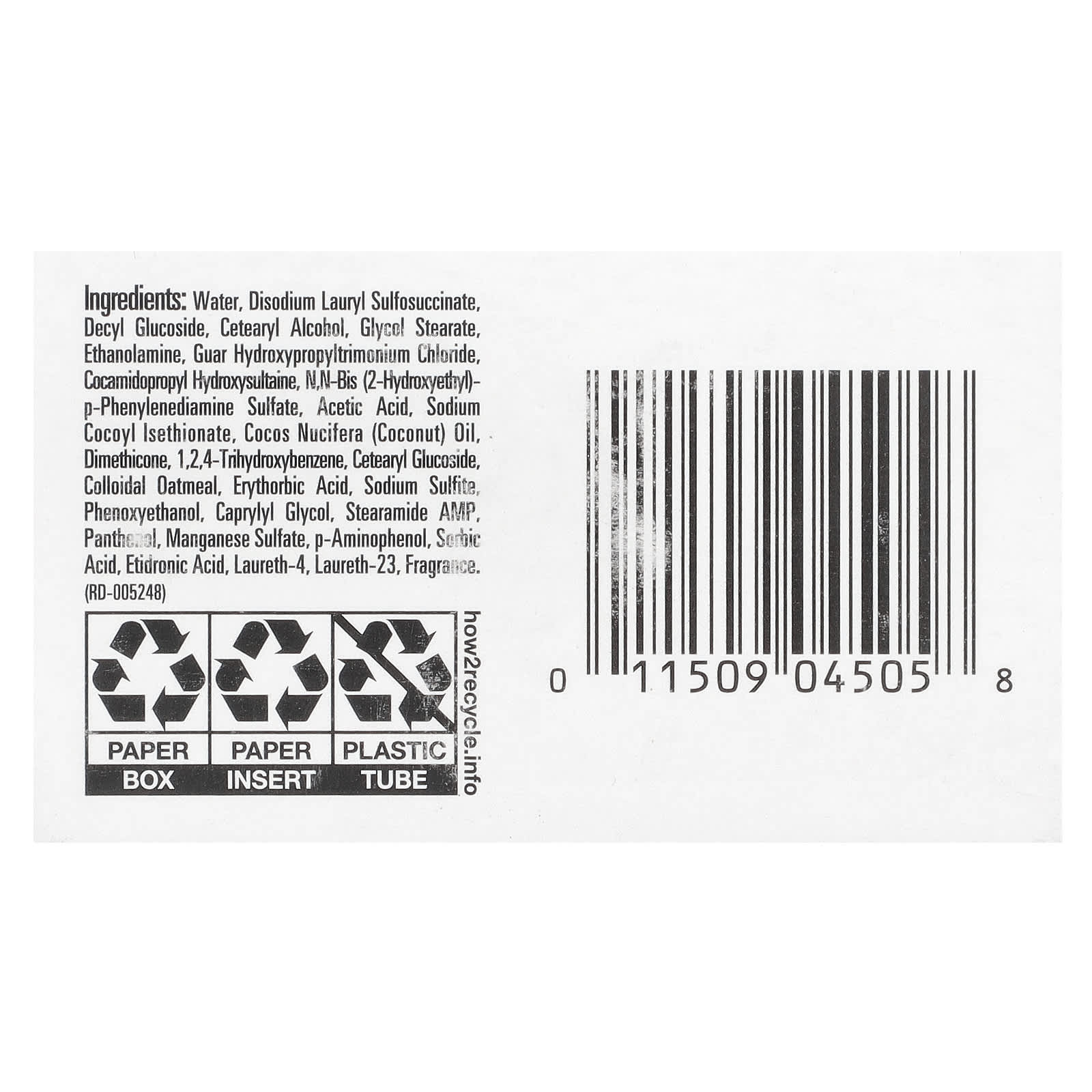 Água, disodium lauryl sulfosuccinate, decyl glucoside, álcool cetoestearílico, monoestearato de etilenoglicol, etanolamina, guar hydroxypropyltrimonium chloride, cocamidopropyl hydroxysultaine, N, sulfato de N-bis (2-hidroxietil)-p-fenilenodiamina, ácido acético, sodium cocoyl isethionate, óleo de Cocos nucifera (coco), dimeticona, 1,2,4,-tri-hidroxibenzeno, glicopiranosídeo cetoestearílico, aveia coloidal, ácido eritórbico, sulfito de sódio, fenoxietanol, caprylyl glycol, estearamida, amp, pantenol, sulfato de manganês, p-aminofenol, ácido sórbico, ácido etidrônico, laureth-4, laureth-23, fragrância.