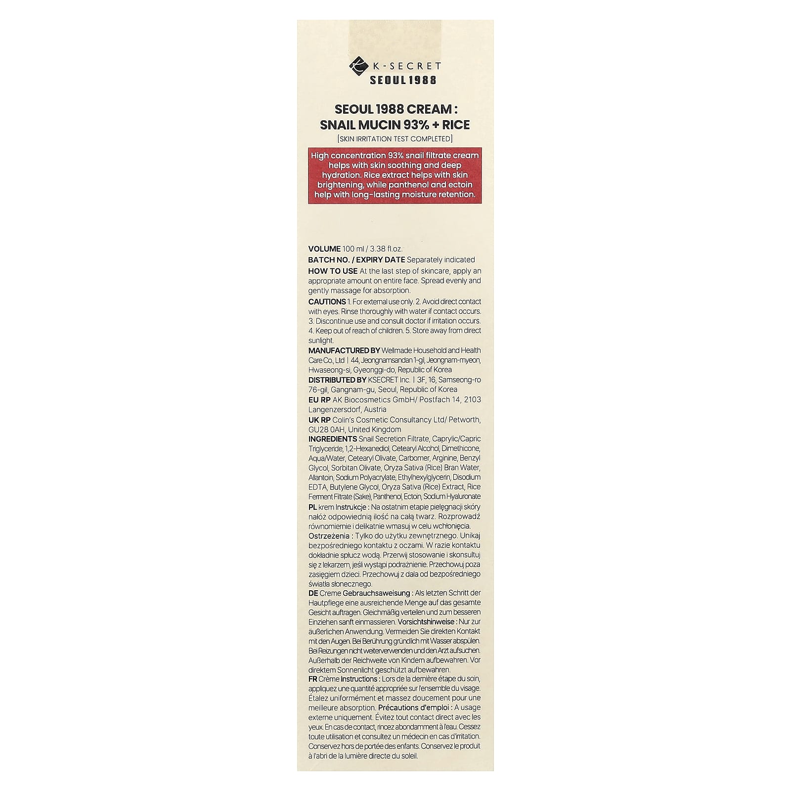 Filtrado de secreção de caracol, triglicerídeo caprílico/cáprico, 1,2-hexanodiol, álcool cetearílico, dimeticona, Água, olivato de cetearil, carbômero, arginina, benzilglicol, olivato de sorbitano, água do farelo de Oryza sativa (arroz), alantoína, sodium polyacrylate, etilhexilglicerina, EDTA dissódico, butilenoglicol, extrato de Oryza sativa (arroz), filtrado de fermentação de arroz (saquê), pantenol, ectoína, hialuronato de sódio.