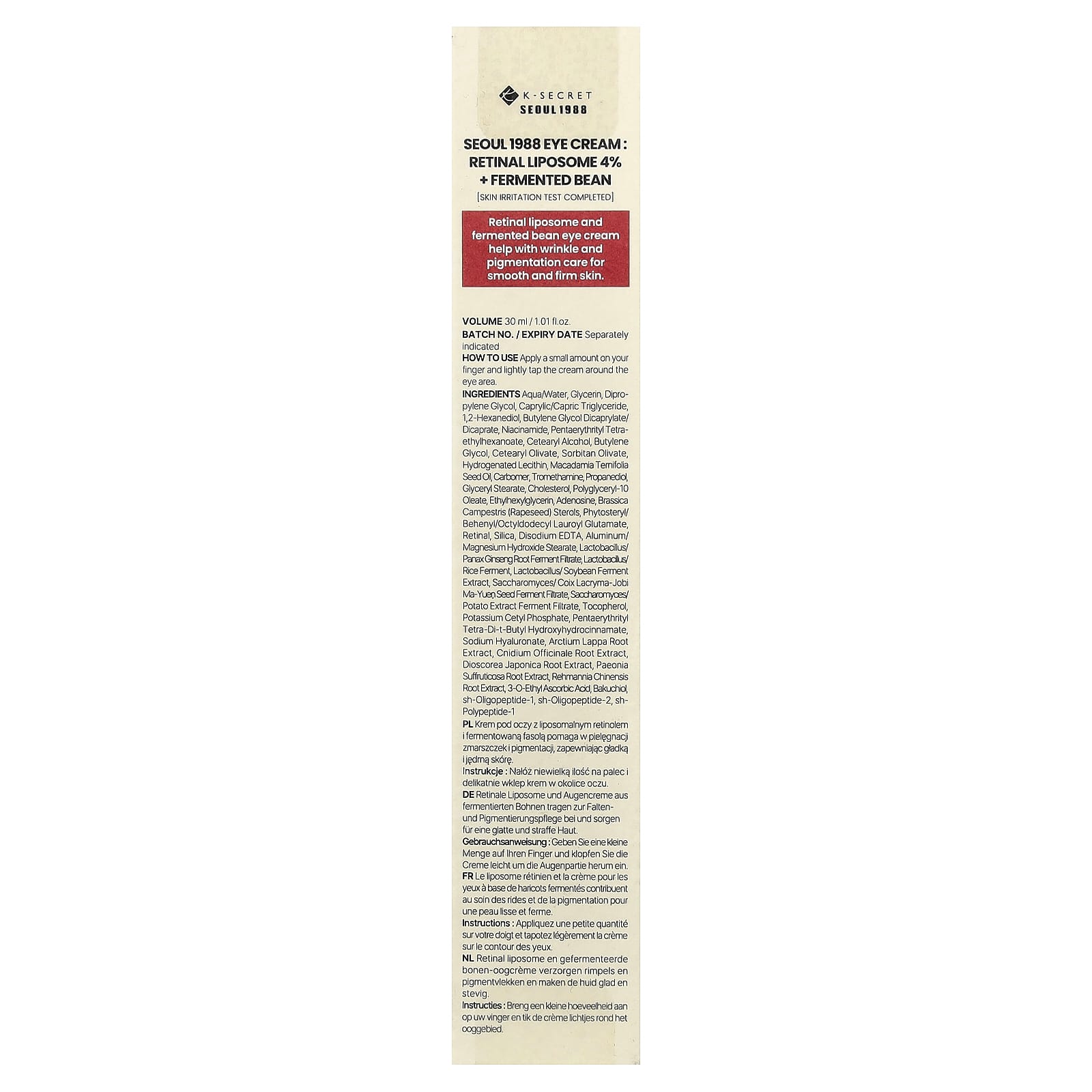 K-Secret Seoul 1988 Creme para a Área dos Olhos Lipossomo da Retina 4% + Feijão Fermentado 30 ml (101 fl oz) – K-Secret Beleza Hidratantes Faciais e Cremes Cremes para os olhos Cremes para a área dos olhos K-Beauty.