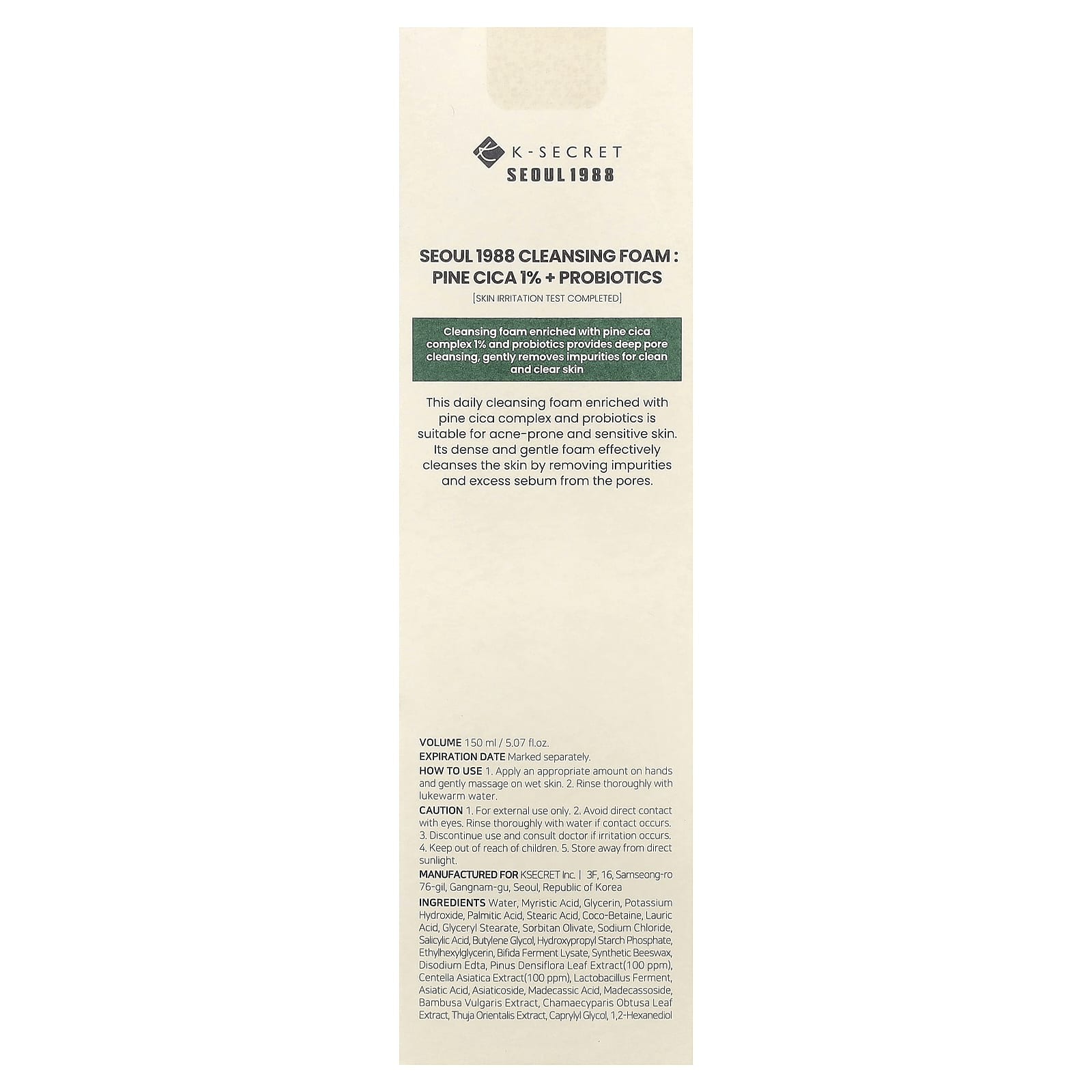 K-Secret Seoul 1988 Espuma de Limpeza Pine Cica 1% + Probióticos 150 ml (507 fl oz) – K-Secret Beleza Limpeza Facial Limpadores faciais K-Beauty.
