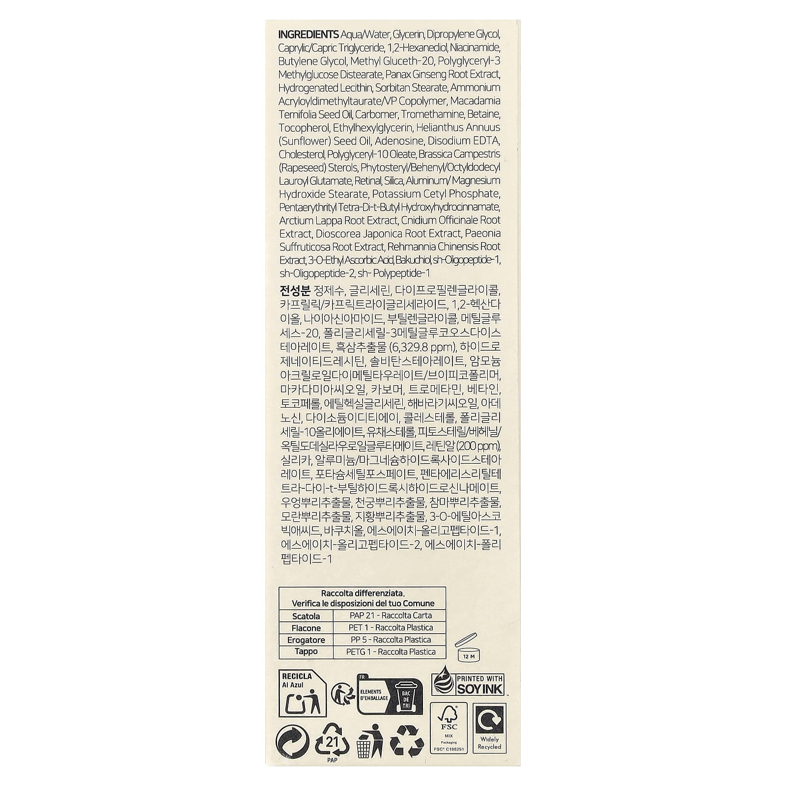 Água, Glicerina, dipropilenoglicol, triglicerídeo caprílico/cáprico, 1,2-hexanodiol, Niacinamida, butilenoglicol, metil gluceth-20, polyglyceryl-3 methylglucose distearate, extrato da raiz de Panax ginseng, lecitina hidrogenada, estearato de sorbitana, ammonium acryloyldimethyltaurate/vp copolymer, Óleo de semente de macadâmia ternifolia, carbômero, Trometamina, betaína, Tocoferol, etilhexilglicerina, Óleo de semente de helianthus annuus (girassol), adenosina, EDTA dissódico, colesterol, oleato de poligliceril-10, esteróis de Brassica campestris (colza), phytosteryl/behenyl/ocyldodecyl lauroy glutamate, na retina, sílica, estearato de hidróxido de alumínio/magnésio, fosfato cetílico de potássio, pentaeritritil tetra-di-t-butil-hidroxihidrocinamato, extrato da raiz de Arctium lappa, extrato da raiz de Cnidium officinale, extrato da raiz de Discorea japonica, extrato de raiz de Paeonia suffruticosa, extrato da raiz de Rehmannia chinensis, Ácido 3-0-etil ascórbico, bakuchio, sh-oligopeptide-1, sh-oligopeptide-2, sh-polipeptídeo-1.