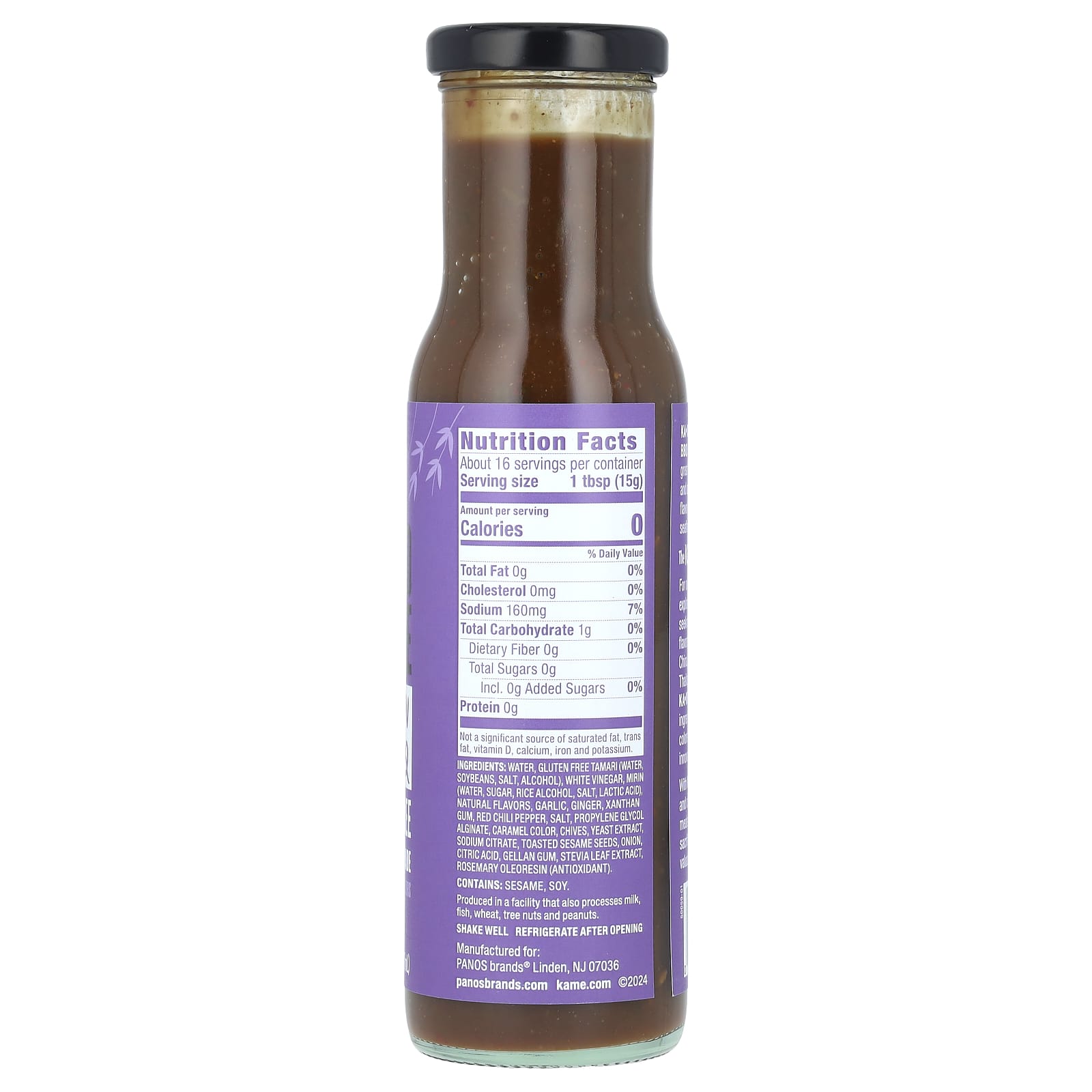Água, tamari sem glúten (água, soja, sal, álcool), vinagre branco, mirin (água, açúcar, álcool de arroz, sal, ácido láctico), sabores naturais, alho, gengibre, goma xantana, pimenta Chili, sal, propylene glycol alginate, corante caramelo, cebolinha, extrato de levedura, citrato de sódio, sementes de gergelim torrado, cebola, ácido cítrico, goma gelana, extrato da folha de estévia, oleorresina de alecrim (antioxidante).