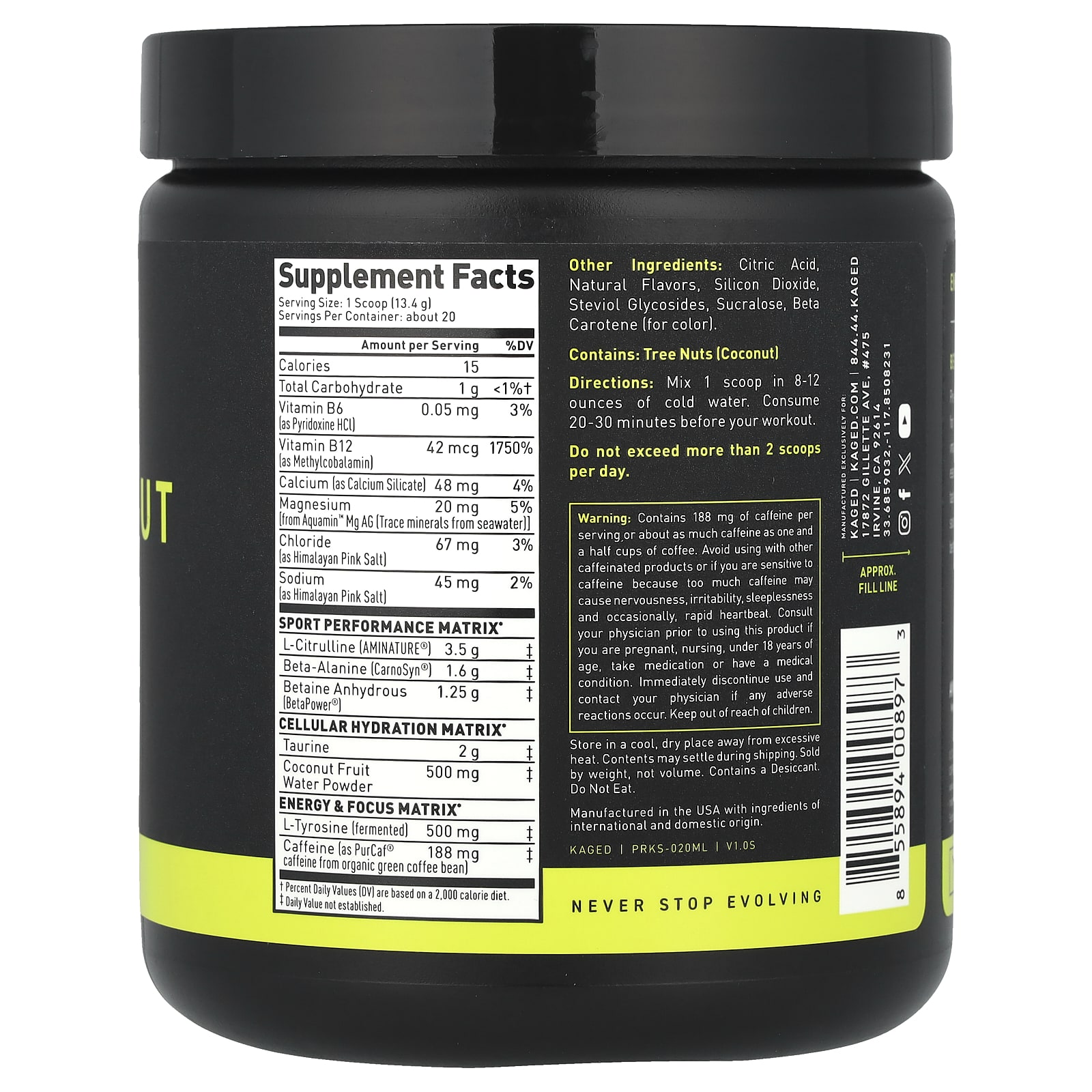 Kaged Pré-treino Sport Manga e Limão 268 g (945 oz) – Kaged Nutrição Esportiva Suplementos Pré-treino Pré-treino estimulante Cafeína.