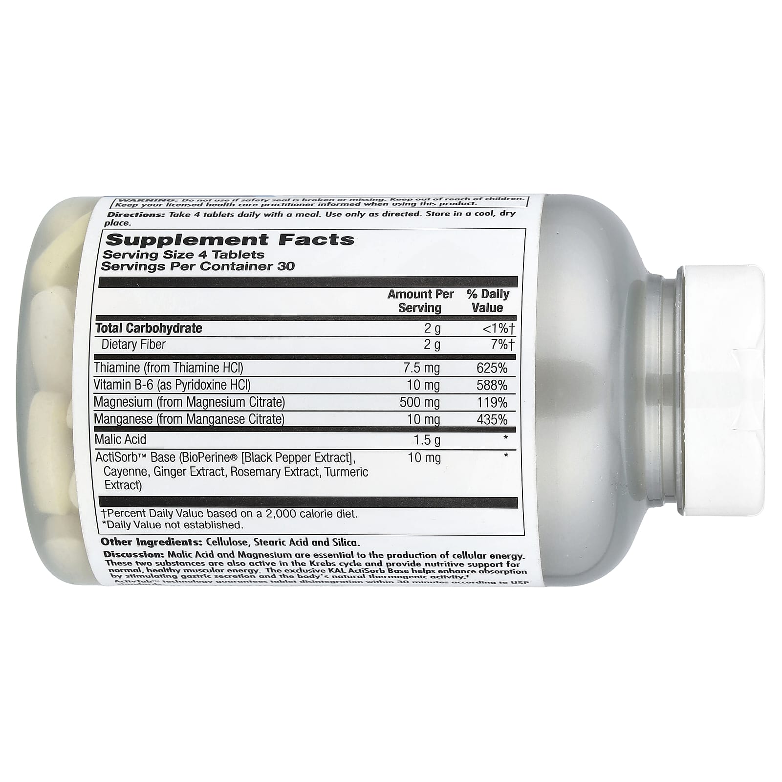 O Ácido Málico e o Magnésio são essenciais para a produção de energia celular. Essas duas substâncias também são ativas no ciclo de Krebs e fornecem suporte nutritivo para energia muscular normal e saudável. A exclusiva Base ActiSorb da KAL ajuda a aumentar a absorção, estimulando a secreção gástrica e a atividade termogênica natural do corpo.