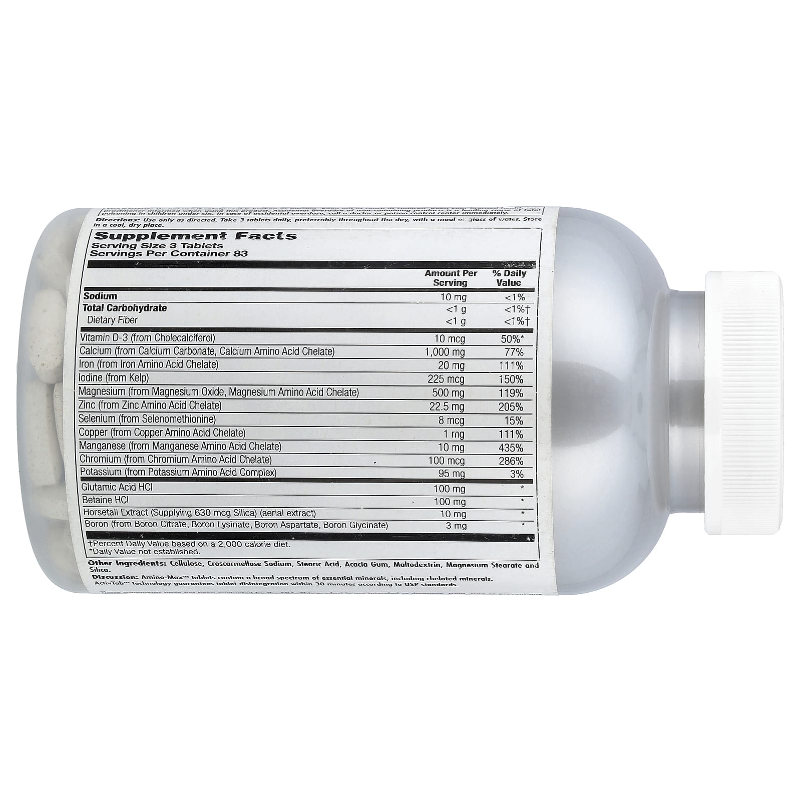 Análise: Os comprimidos Amino-Max™ contêm um amplo espectro de minerais essenciais, incluindo minerais quelados.