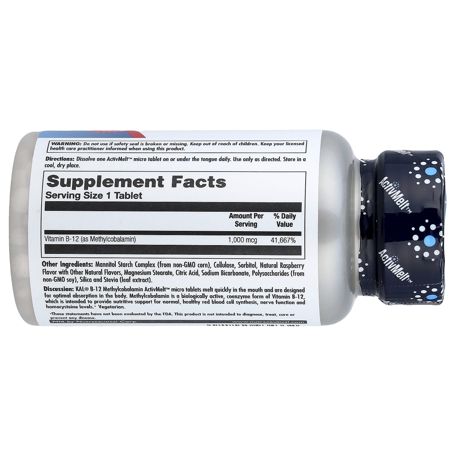 Análise: Os microcomprimidos B-12 Mecobalamina ActivMelt™M da KAL® derretem rapidamente na boca e são desenvolvidos para uma absorção ideal pelo corpo. A mecobalamina é uma forma de coenzima biologicamente ativa da Vitamina B-12, que se destina a fornecer suporte nutritivo para a síntese de glóbulos vermelhos saudáveis, função nervosa e níveis de homocisteína.