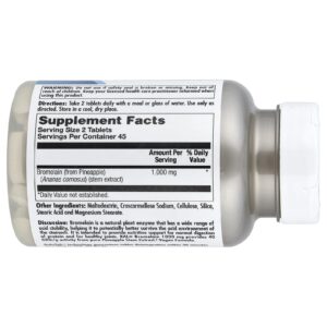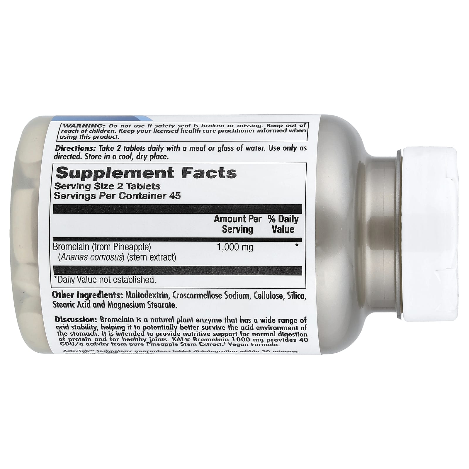 Análise: A bromelina é uma enzima vegetal natural que possui uma ampla gama de estabilidade ácida, ajudando-a a sobreviver melhor no ambiente ácido do estômago. Ele destina-se a fornecer suporte nutritivo para a digestão normal de proteínas e para articulações saudáveis. A Bromelina 1.000 mg da KAL® fornece 40 GDU/g de atividade do Extrato do Caule de Abacaxi puro.