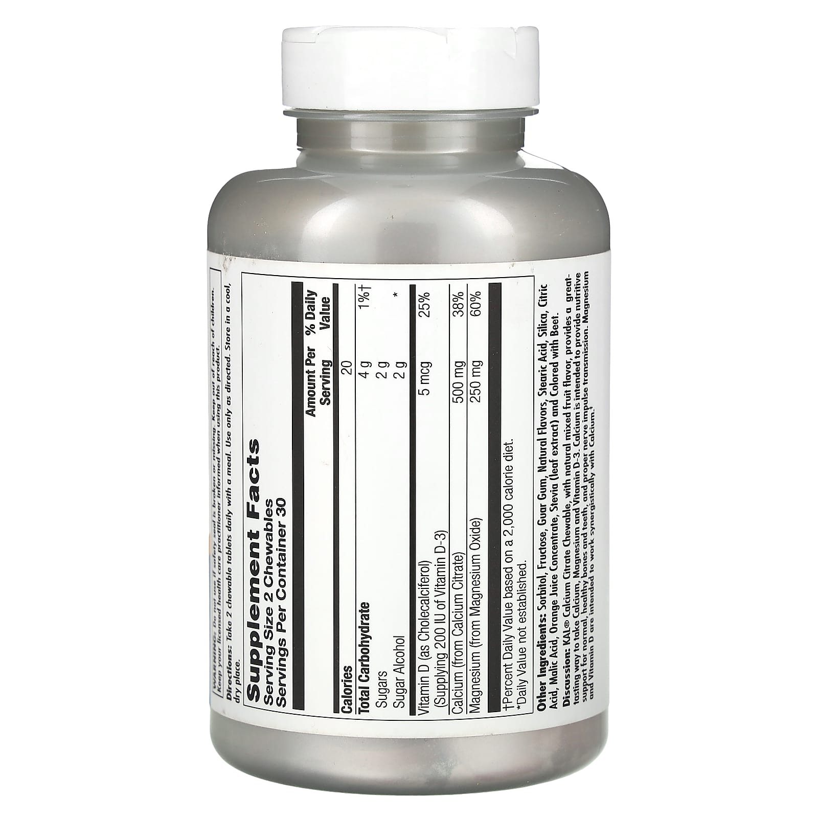 Análise: O Citrato de Cálcio Mastigável da KAL®, com sabor natural de frutas mistas, é uma forma saborosa de ingerir Cálcio, Magnésio e Vitamina D-3. O Cálcio se destina a fornecer suporte nutritivo para ossos e dentes normais e saudáveis, para a transmissão adequada dos impulsos nervosos e para a contração muscular. Magnésio e Vitamina D se destinam a trabalhar sinergicamente com o Cálcio.