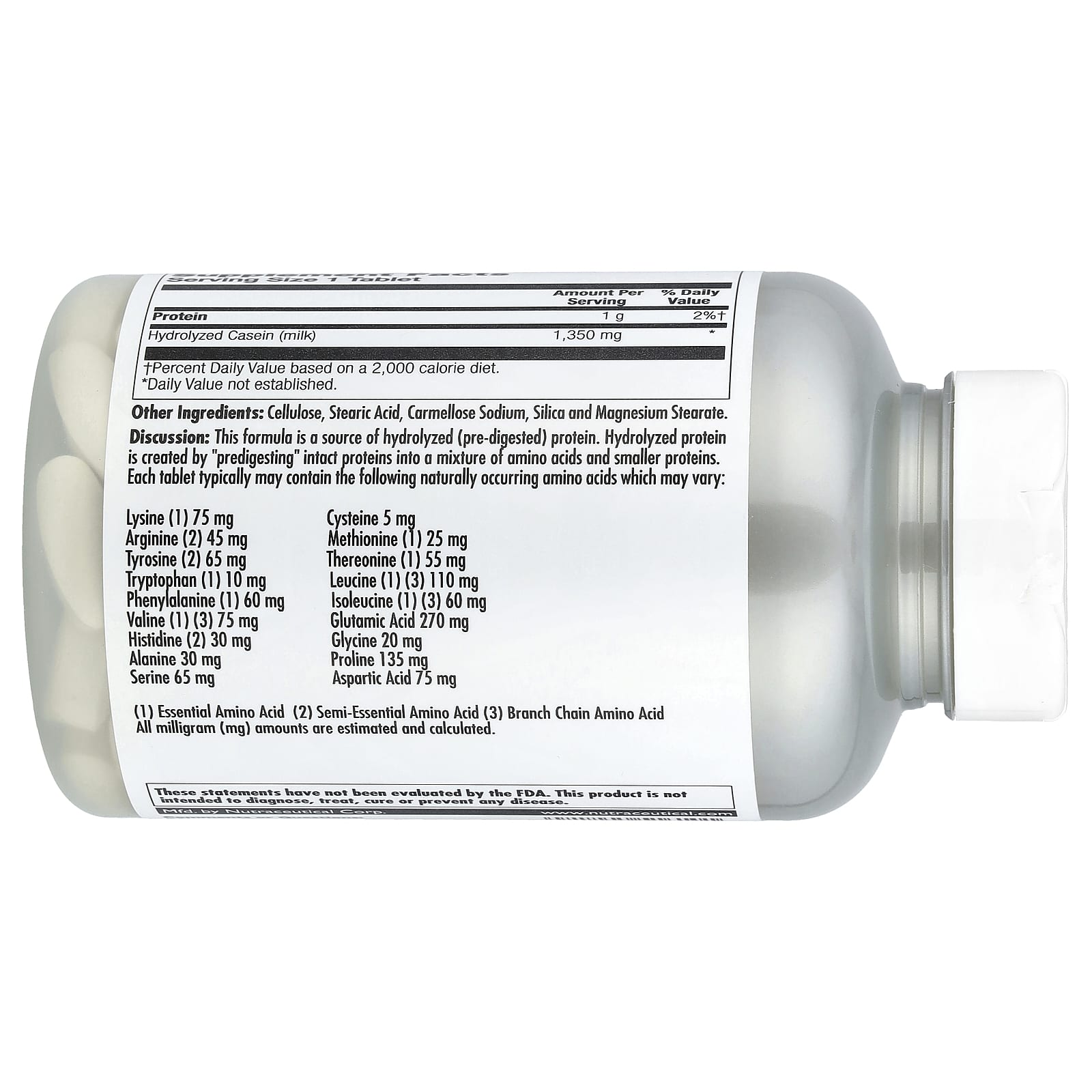 Análise: Esta fórmula é fonte de proteína hidrolisada (pré-digerida). A Proteína Hidrolisada é criada por meio da “pré-digestão” de proteínas intactas em uma mistura de aminoácidos e proteínas menores. Cada comprimido pode normalmente conter os seguintes aminoácidos de ocorrência natural, que podem variar: