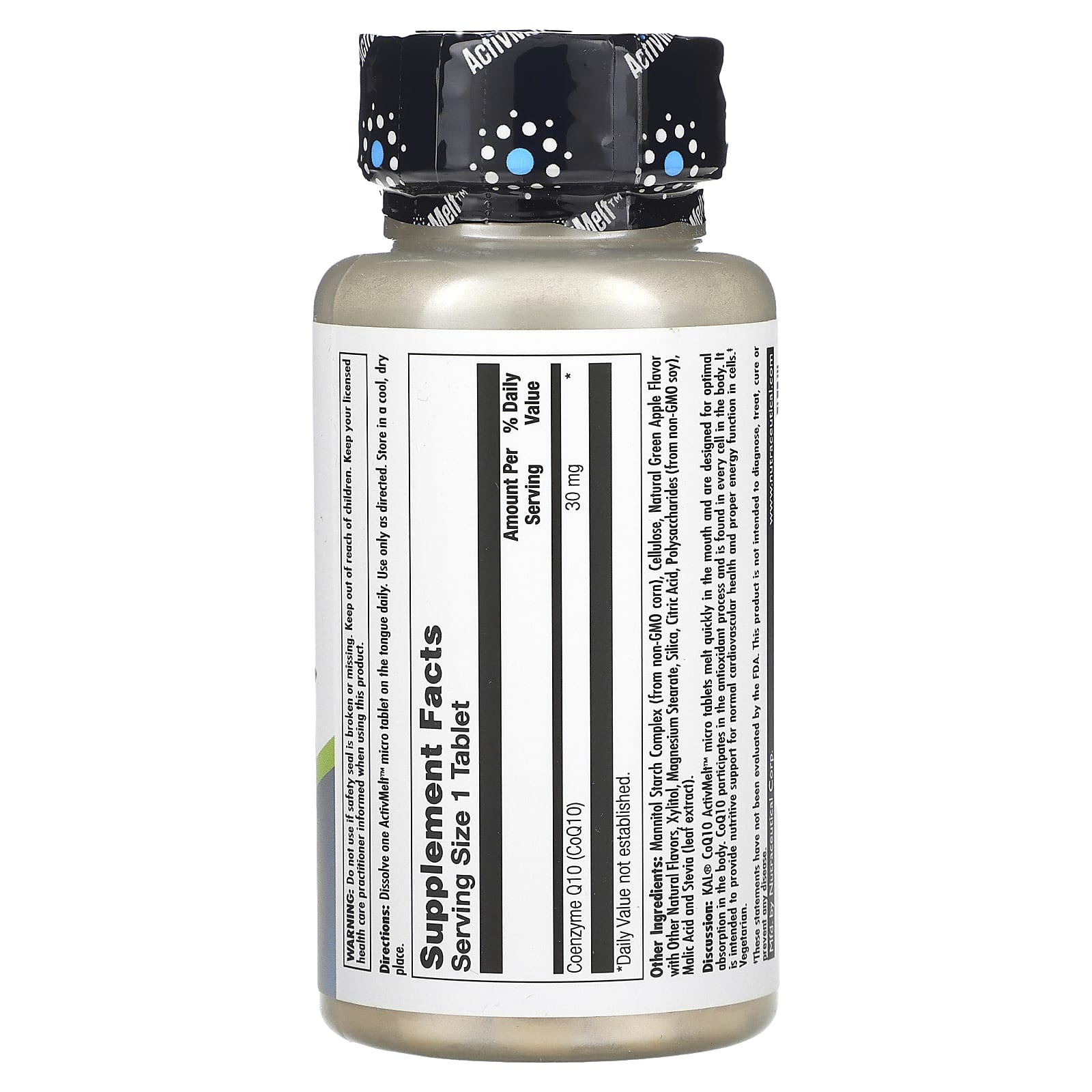 Análise: Os microcomprimidos KAL® CoQ10 ActivMelt ™ derretem rapidamente na boca e são projetados para absorção ideal no corpo. A CoQ10 participa do processo antioxidante e é encontrada em todas as células do corpo. Destina-se a fornecer suporte nutritivo para a saúde cardiovascular normal e o funcionamento adequado da energia nas células.