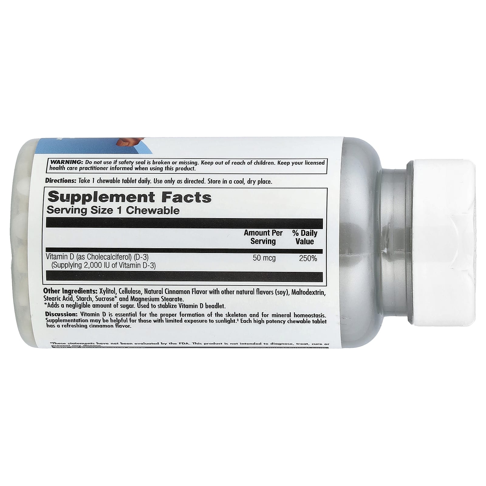 A vitamina D é essencial para a formação adequada do esqueleto e para a homeostase dos minerais. A suplementação pode ser útil para pessoas com exposição limitada à luz solar. Cada comprimido mastigável de alta potência tem um sabor refrescante de canela.