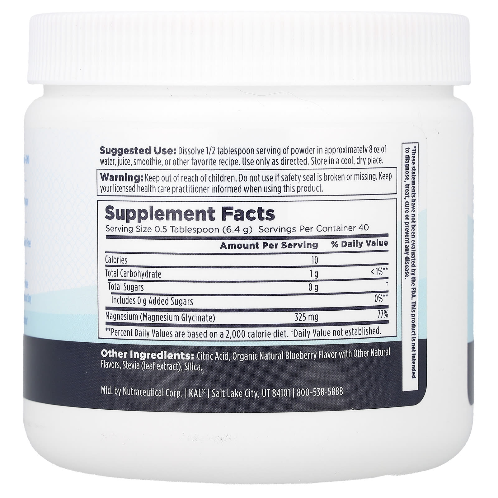 KAL Magnésio Calmante em Pó Mirtilo 256 g (9 oz) – KAL Suplementos Minerais Magnésio Glicinato de Magnésio.