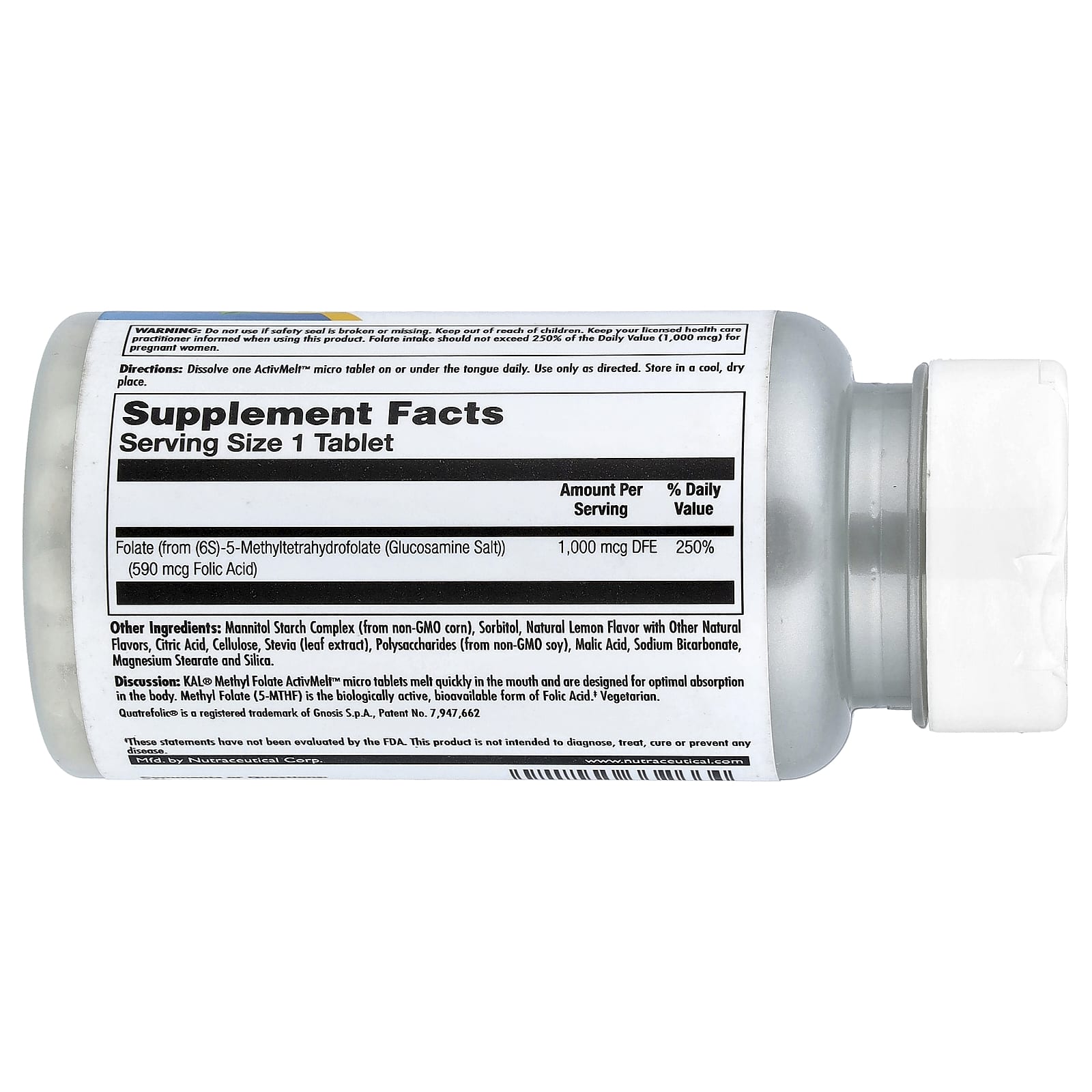 Análise: Os microcomprimidos Methyl Folate ActivMelt™ da KAL® derretem rapidamente na boca e são desenvolvidos para uma absorção ideal pelo corpo. O Metilfolato (5-MTHF) é a forma biologicamente ativa e biodisponível do Ácido Fólico.