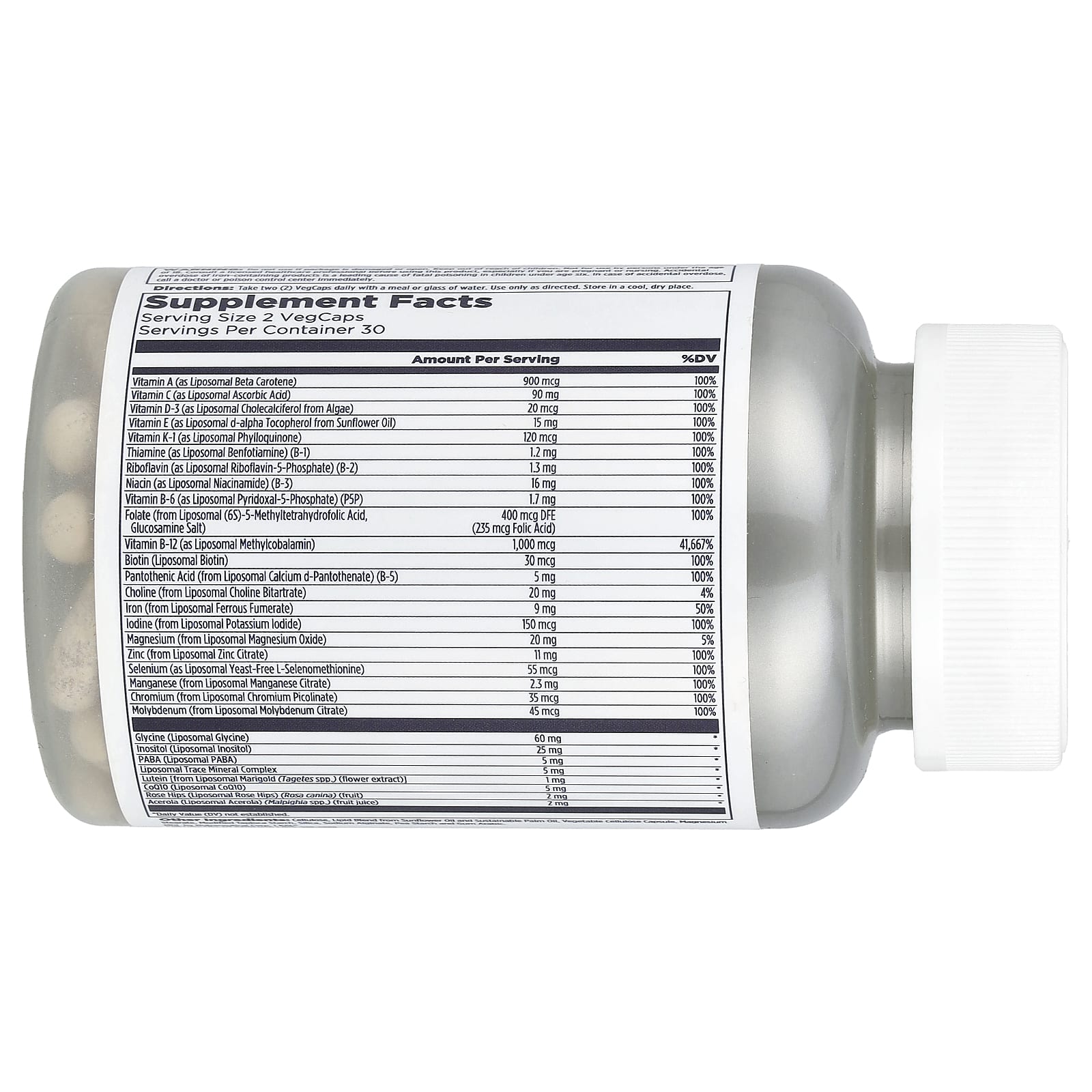 Análise: Esta fórmula aprimorada contém 22 vitaminas e minerais essenciais. Juntos, eles fornecem suporte à saúde cardiovascular, à função do sistema nervoso, à energia celular, aos ossos, aos músculos e à imunidade. Os lipossomos são pequenas estruturas esféricas feitas de fosfolipídios. Essa estrutura protetora ajuda a cápsula a permanecer estável até chegar ao intestino delgado, onde se decompõe. Isso ajuda a promover uma digestão suave.