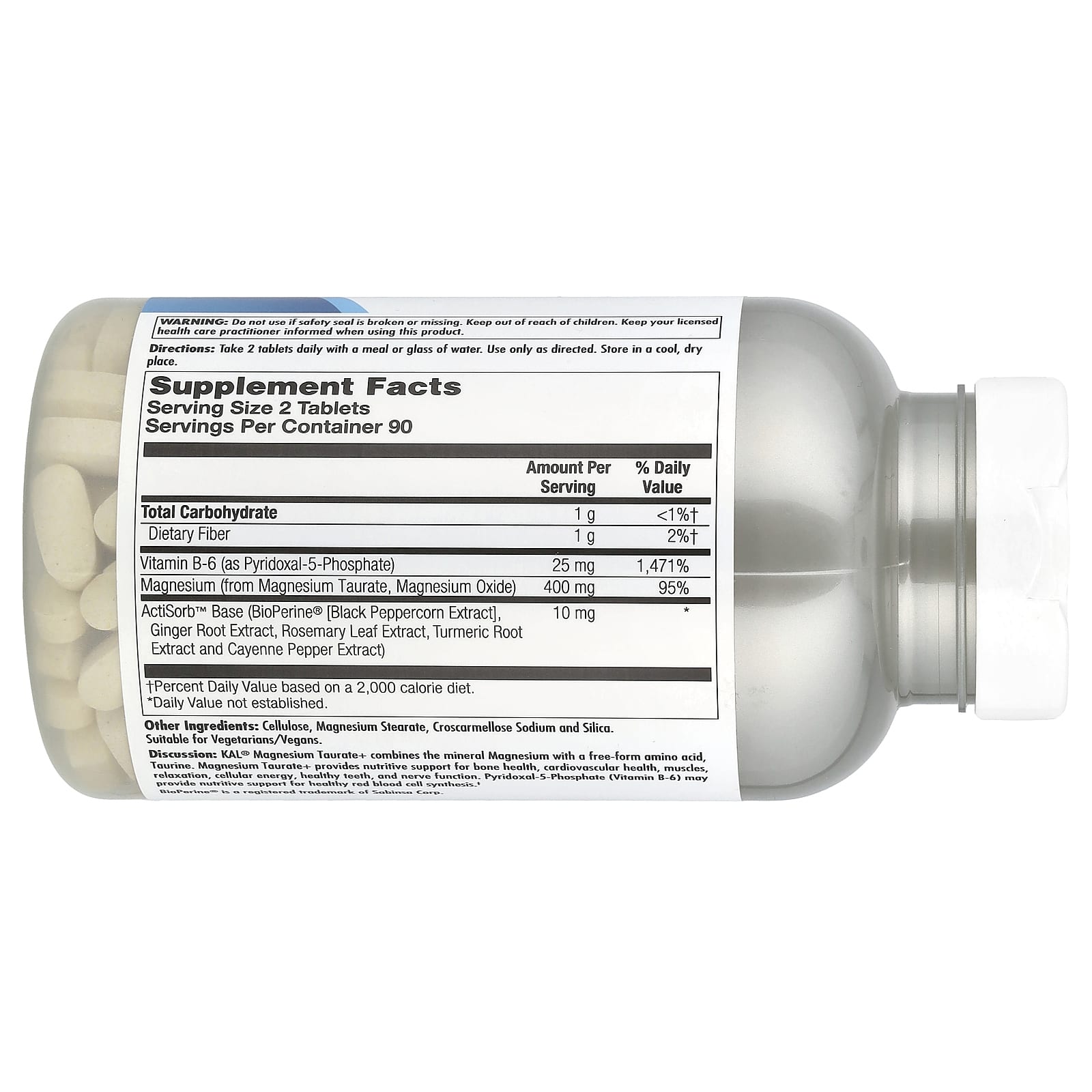 Análise: o Taurato de Magnésio + da KAL® combina o mineral Magnésio com um aminoácido de forma livre, a Taurina. O Magnésio Taurato+ fornece suporte nutritivo para a saúde óssea, saúde cardiovascular, músculos, relaxamento, energia celular, dentes saudáveis e função nervosa. O Fosfato de Piridoxal (Vitamina B-6) fornece suporte nutritivo para a síntese de glóbulos vermelhos saudáveis.