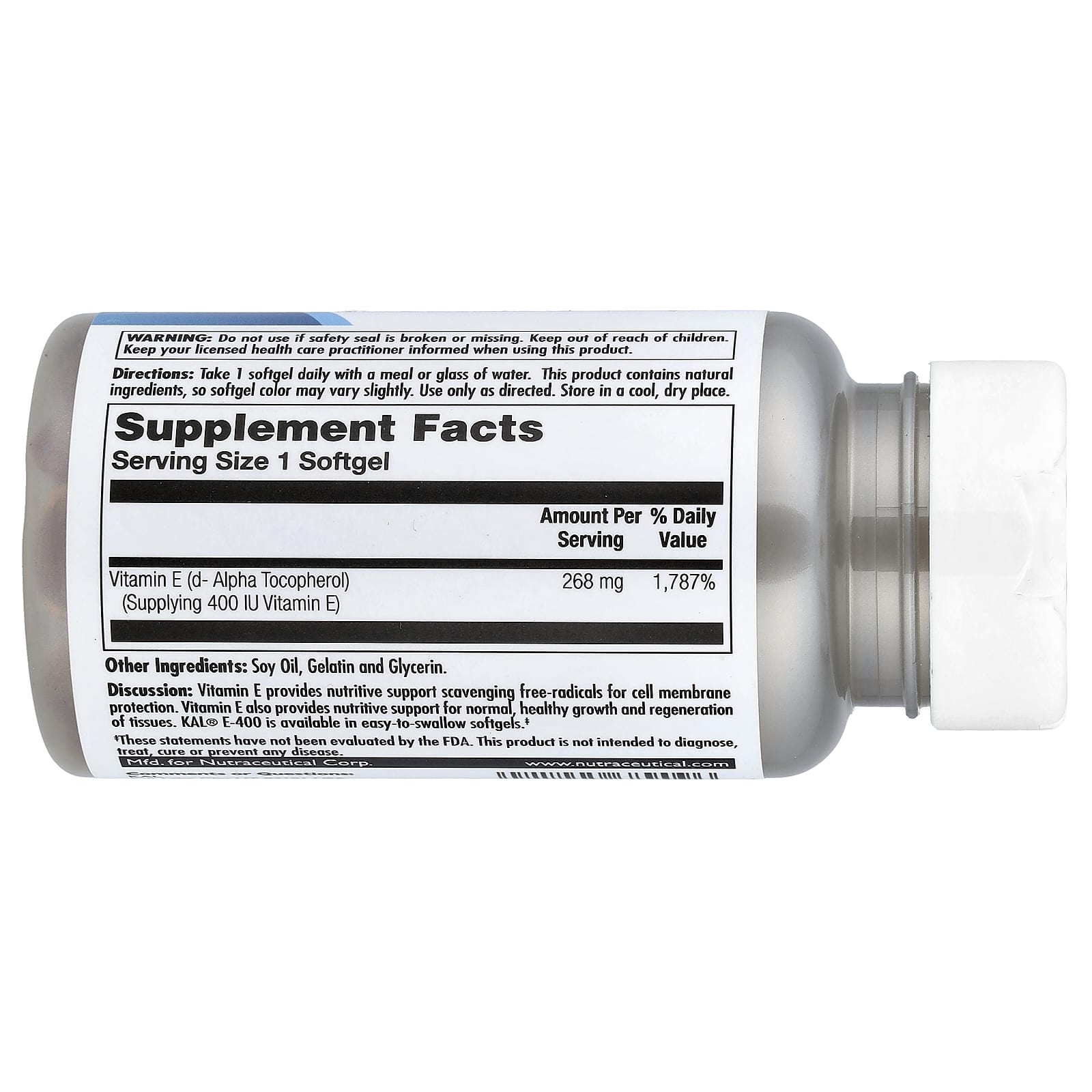 Análise: A vitamina E fornece suporte nutritivo na eliminação de radicais livres para proteção da membrana celular. A vitamina E também fornece suporte nutritivo para o crescimento normal e saudável e a regeneração dos tecidos. KAL® E-400 está disponível em cápsulas softgel fáceis de engolir.