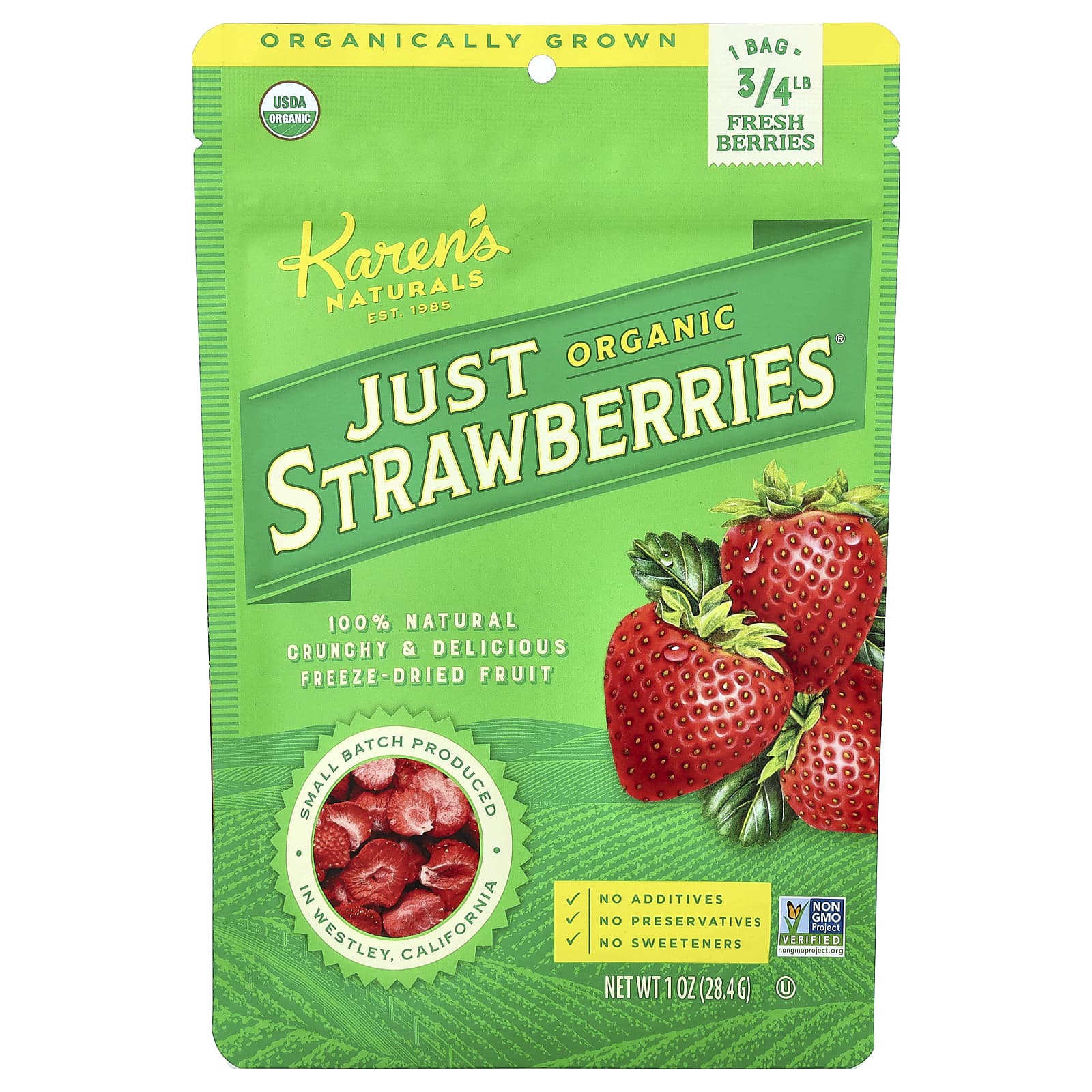 Karens Naturals Just Strawberries® Orgânico 284 g (1 oz) – Karen’s Naturals Alimentos Petiscos e lanches Frutas e Legumes Secos Morangos Snacks de frutas e vegetais.