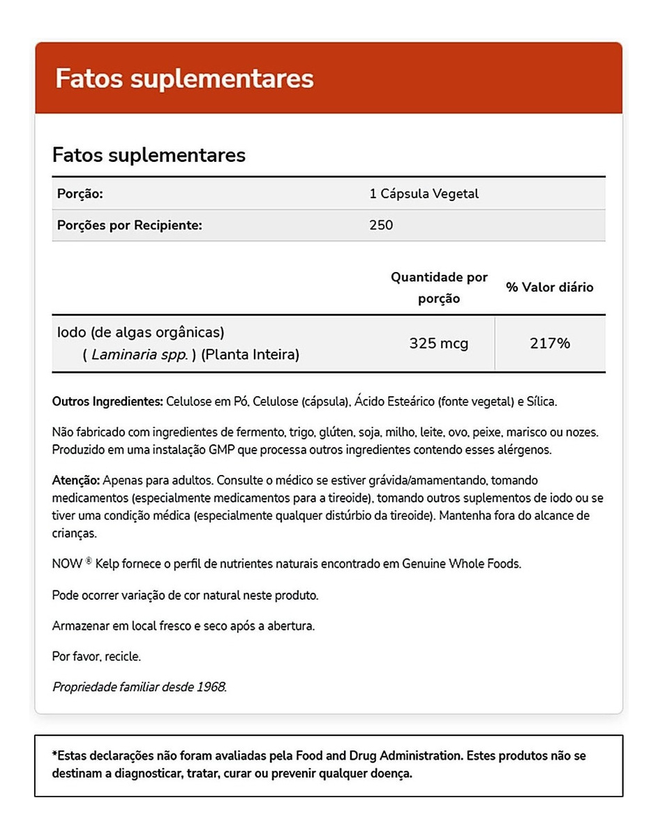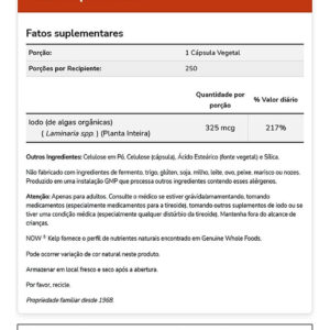 Avis: somente para adultos. Consulte um médico se estiver grávida, amamentando ou tomando medicamentos (especialmente medicamentos para a tireoide), se estiver tomando outros suplementos de iodo ou se tiver um problema de saúde (especialmente distúrbios da tireoide). Mantenha fora do alcance de crianças.