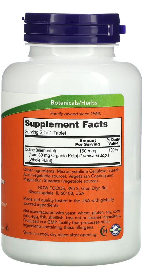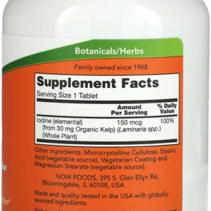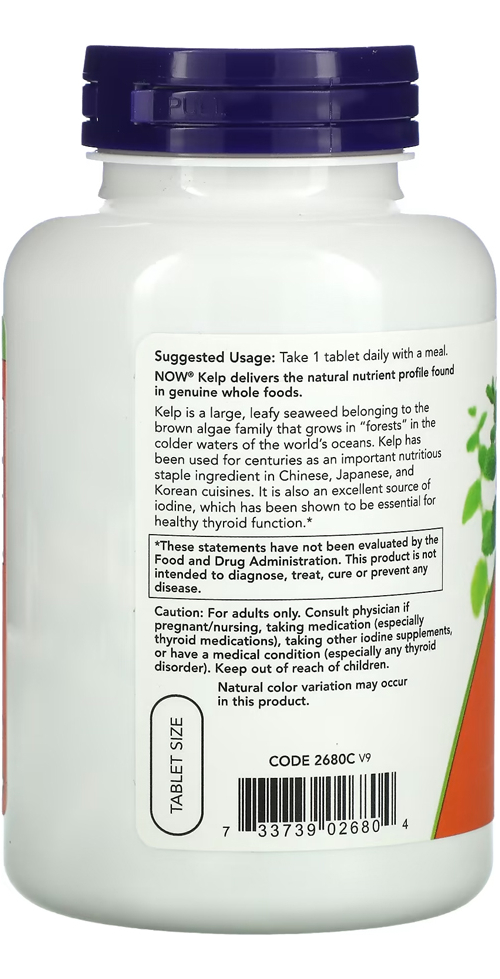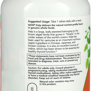 Suplemento de Kelp: A Kelp da Now Foods é um suplemento nutricional de alta qualidade, formulado para promover o bem-estar geral. Cada tablete contém 150mcg de Kelp, uma alga marinha conhecida pelo seu alto teor de Iodo;